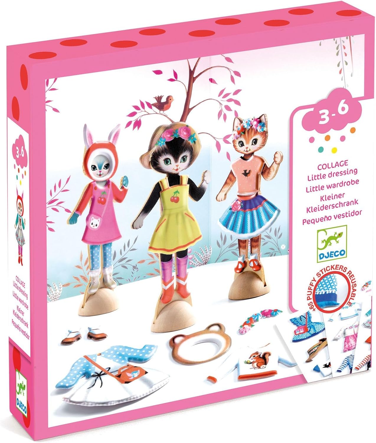 Contents: 3 wooden cats with stand, + 45 sturdy reusable items of clothing (3 sheets), 3 cardboard scenes and 1 step-by-step instruction booklet.