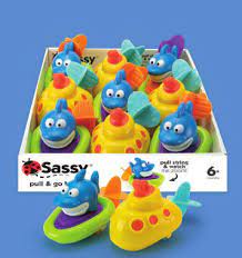 Sassy's pull and go boat zip through the water for fantastic bath time play. It has an easy to pull string, perfect for little hands. No batteries required. Assortment of pelican or penguin.Sassy's pull and go boat zip through the water for fantastic bath time play. It has an easy to pull string, perfect for little hands. No batteries required