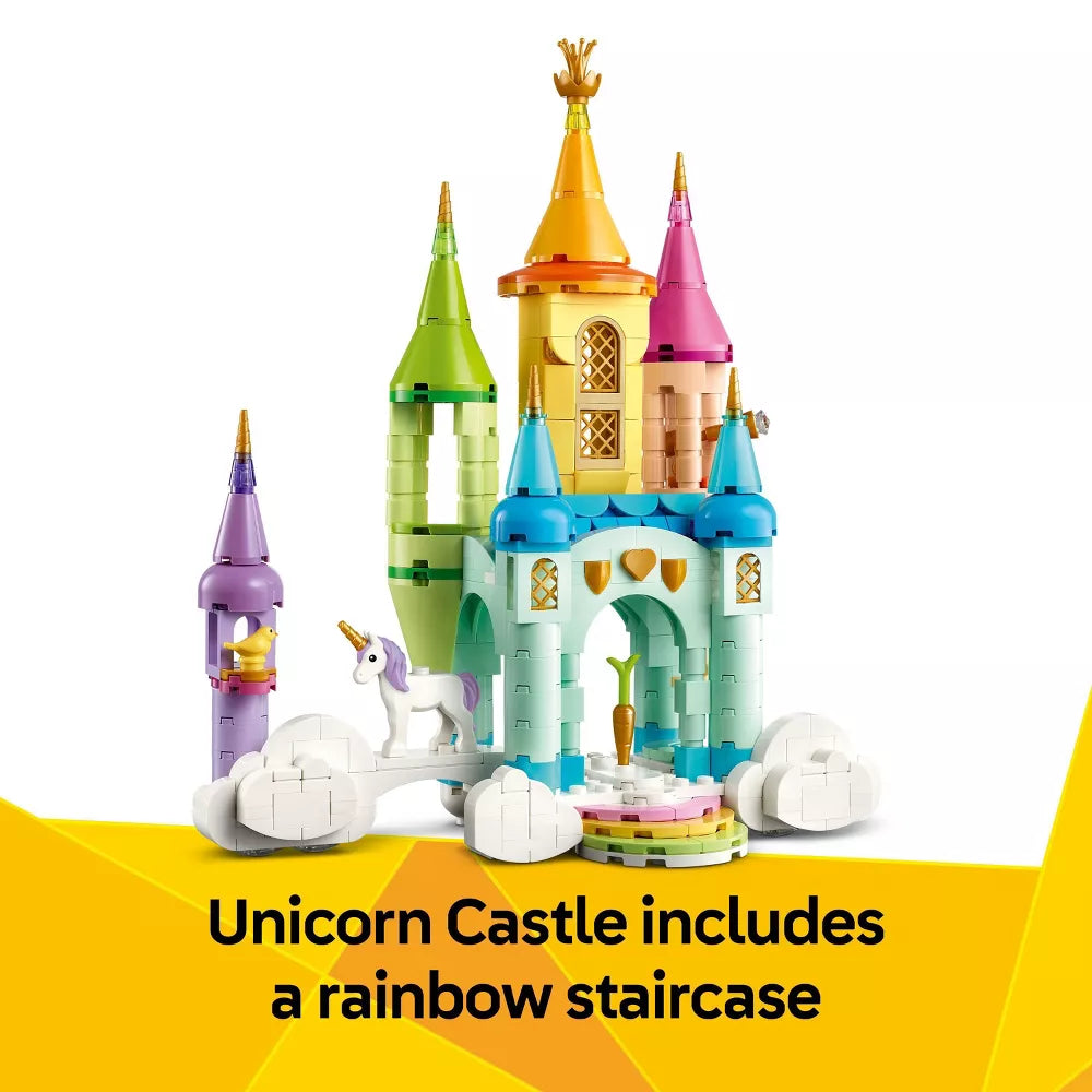 Fantasy dreams come to life with the LEGO Creator 3 in 1 Unicorn Castle (31175) building set for kids 8 years old and up! Young dreamers can create three different enchanted worlds with the same collection of bricks. They can start by constructing the magnificent unicorn castle with fun fantasy features including four towering spires, two turrets, a colorful rainbow staircase, a fountain, a diamond room, a telescope for stargazing, a charming bird and birdcage, and a golden carrot for feeding magical creatures. The enchanted building adventure continues as young fantasy fans transform their castle into a whimsical unicorn ship with a rainbow sail for navigating through magical seas, then rebuild again into an enchanted playground complete with a forest cabin, garden, and picnic table for outdoor adventures. This versatile building set includes three beautiful unicorn toys: a sunny yellow Pegasus, a rosy pink Pegasus, and a majestic white unicorn, who all help kids bring their pretend play stories to life! Perfect for young fantasy lovers who enjoy creating magical and imaginative adventures, these building blocks make an ideal birthday gift for girls and boys who love unicorn toys. LEGO Creator 3 in 1 sets (each sold separately) deliver hours of pretend play fun that evolves with every rebuild. The LEGO Builder app enhances the experience with helpful 3D viewing tools. Contains 390 pieces.