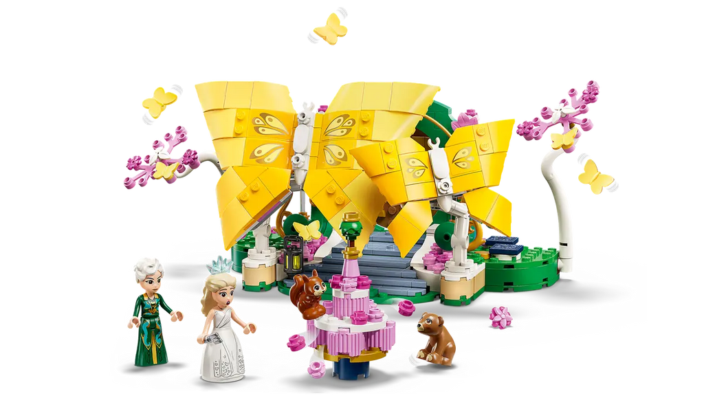 Kids pull apart the giant posable LEGO butterfly building toys to reveal the wedding scene. This fantasy gift packed with recognizable details from the movie, including the wedding cake, is a heart-shaped invitation and Glinda’s bouquet from Fiyero. For authentic role play Glinda wears the gown and tiara from the movie, and has a changeable face as her day flips from delight to disaster when the included animal figures rampage through the scene.