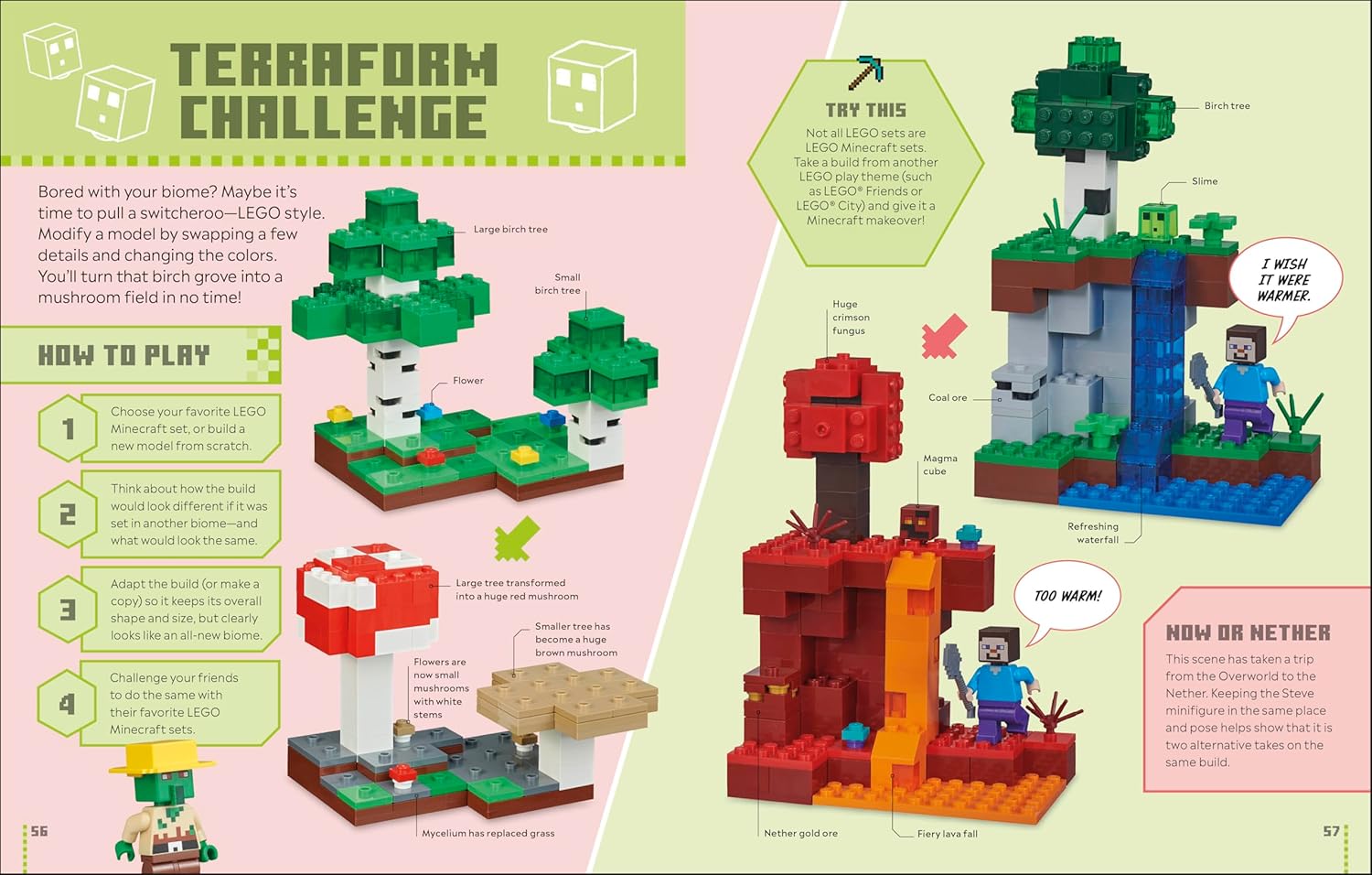 Challenge friends to a Nether minecart race. Find the odd crafting block out. Design your own LEGO Minecraft fairground. And much more!