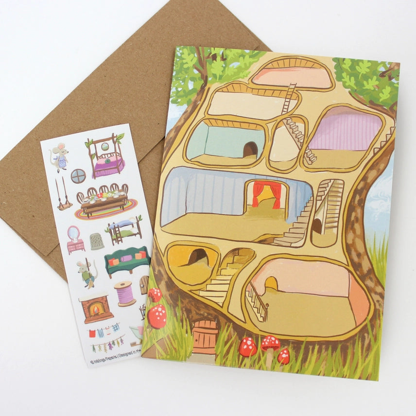 Our hand-illustrated Mouse House Sticker Scene greeting card comes with an adorable sheet of mini vinyl stickers to decorate the scene and make it your own. Its exterior is coated with a special finish, making the stickers easy to adjust and reposition again and again! This card would be the sweetest little gift for a child's birthday, and comes blank inside for your own message.