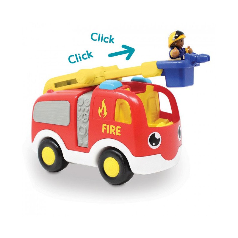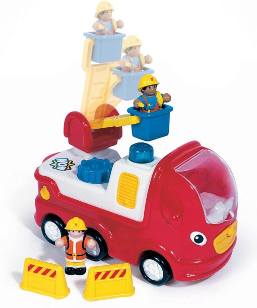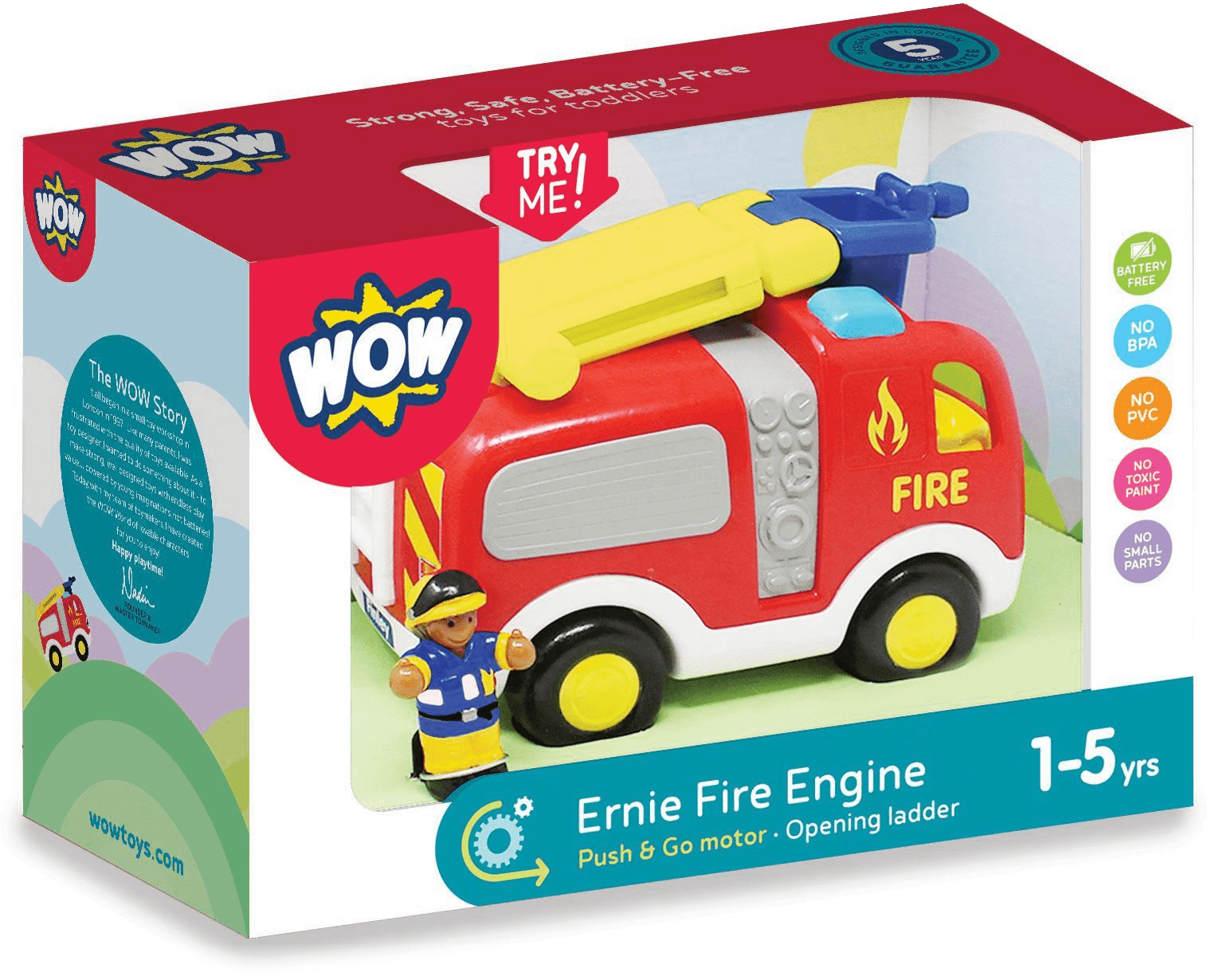 Meet Ernie Fire Truck and his crew of Jack and Karen, who ride the friction-powered fire truck from WOW. Truck has realistic engine sounds, revolving reflector lights, rotating clicking ladder, push-button back door and a fire bell. Role-play, social interaction, and motor skill development accompany the fun.