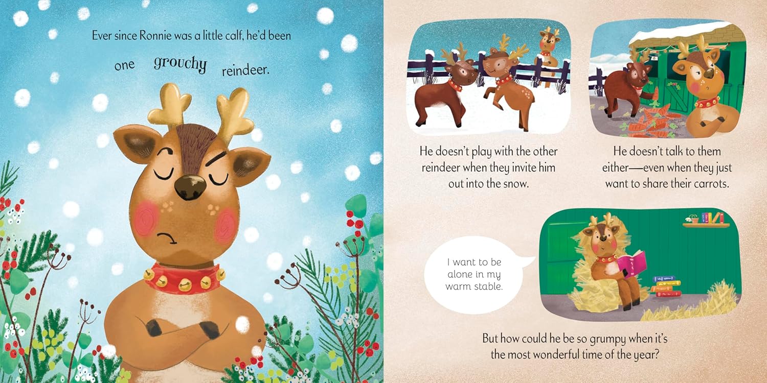 It’s the most wonderful time of the year! But not for one grumpy reindeer. He huffs and puffs and scares all the other reindeer off. But when Santa asks for his help, grumpy reindeer soon realizes that sometimes being on your own isn’t fun after all… With the most festive illustrations, adults and children will love to read aloud and follow the story of this reindeer to see if his frown turns upside down!