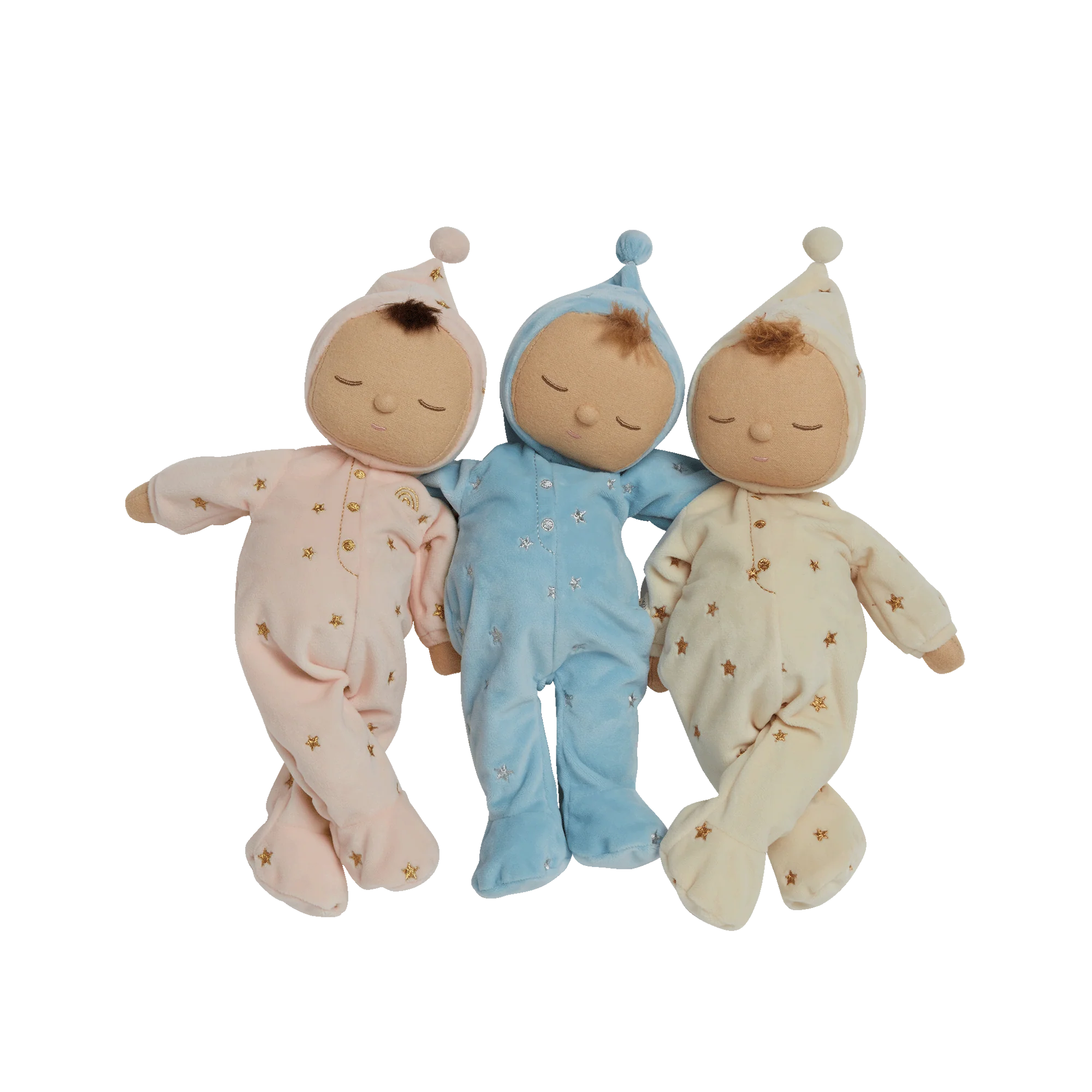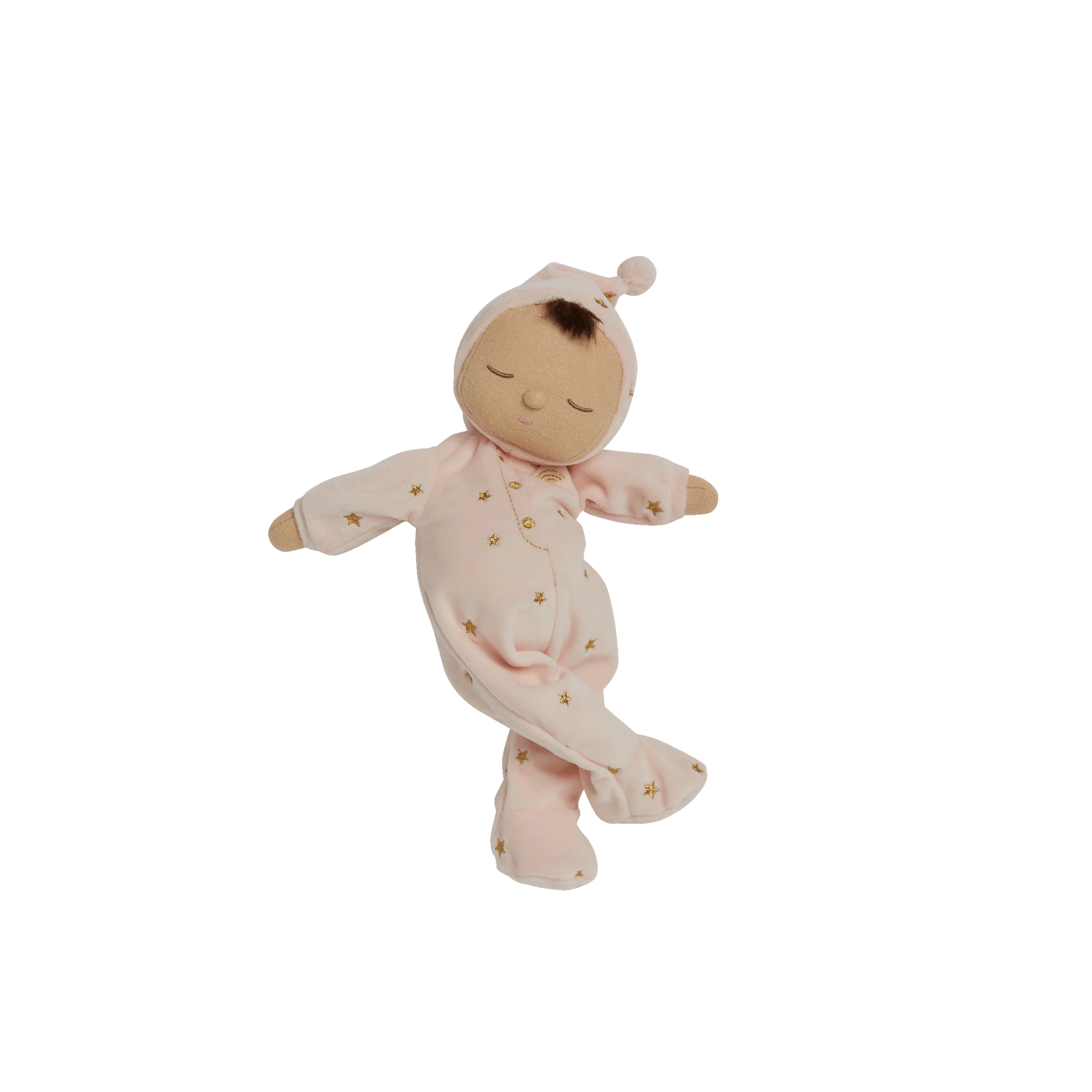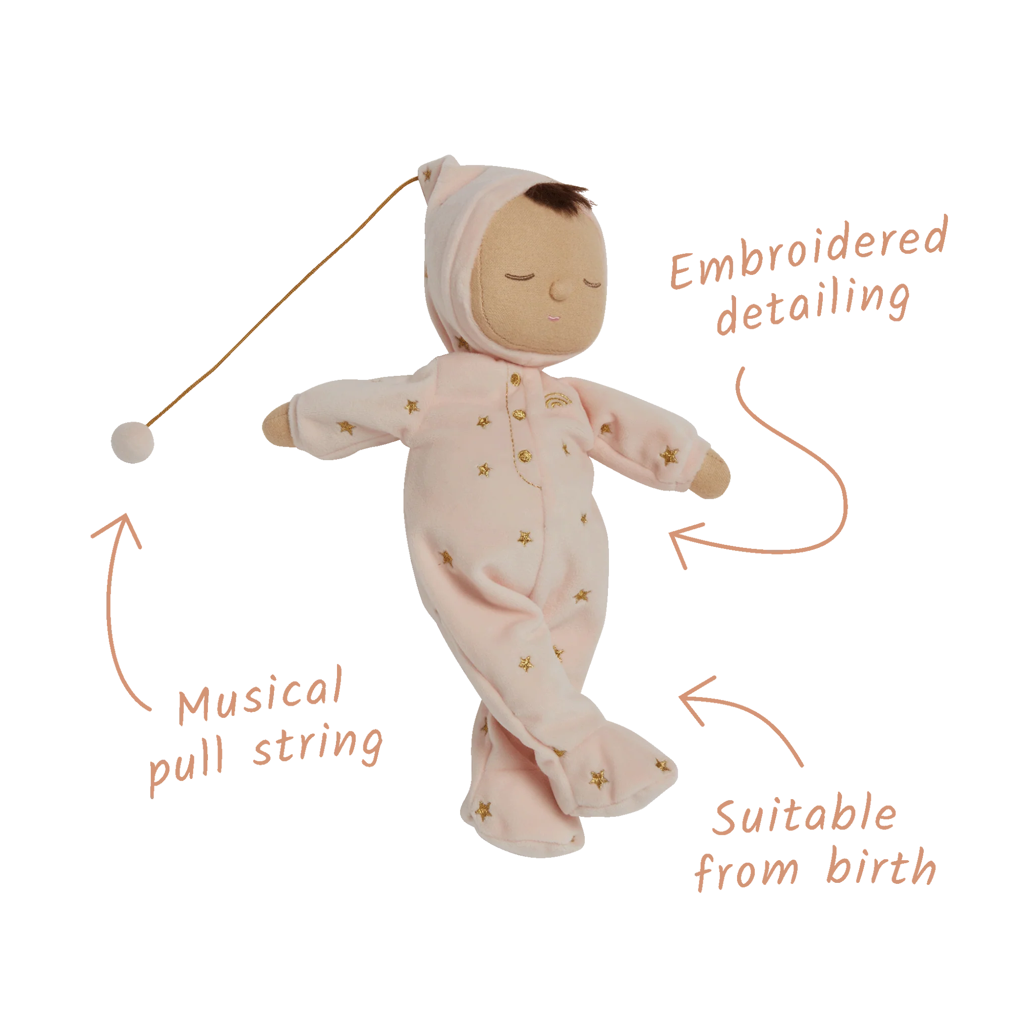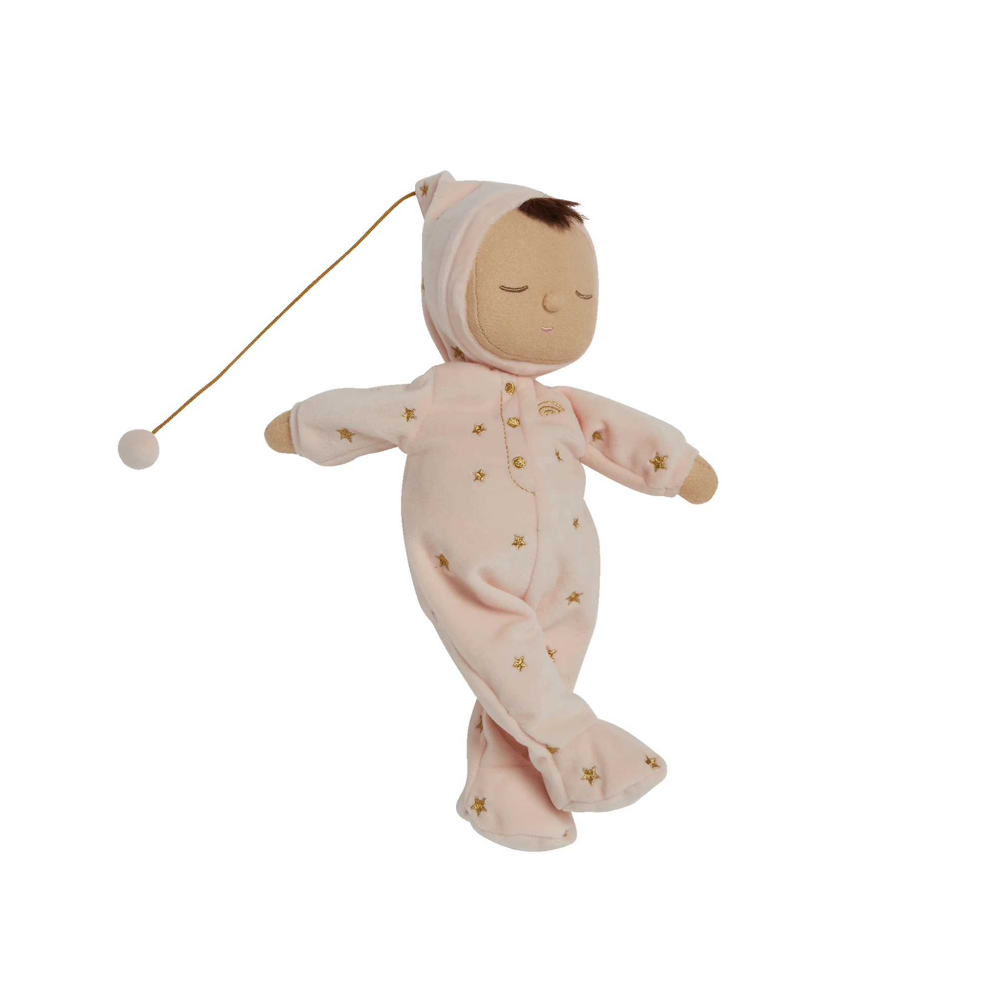 A. Our limited-edition Lullaby Dozy Dinkums are truly magical with a built-in mechanical music box. Each doll plays the timeless melody 'Twinkle Twinkle Little Star' when you gently pull the attached string, adorned with a soft pompom. The tune will begin playing, creating a magical atmosphere for a cozy bedtime routine.