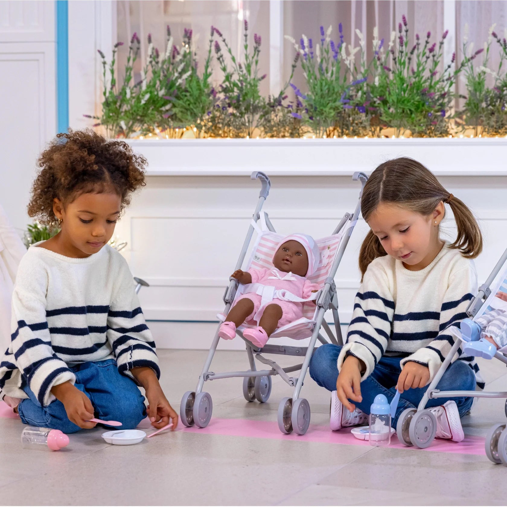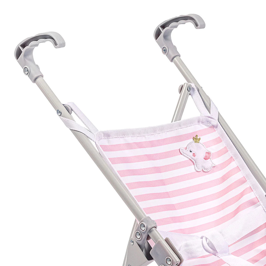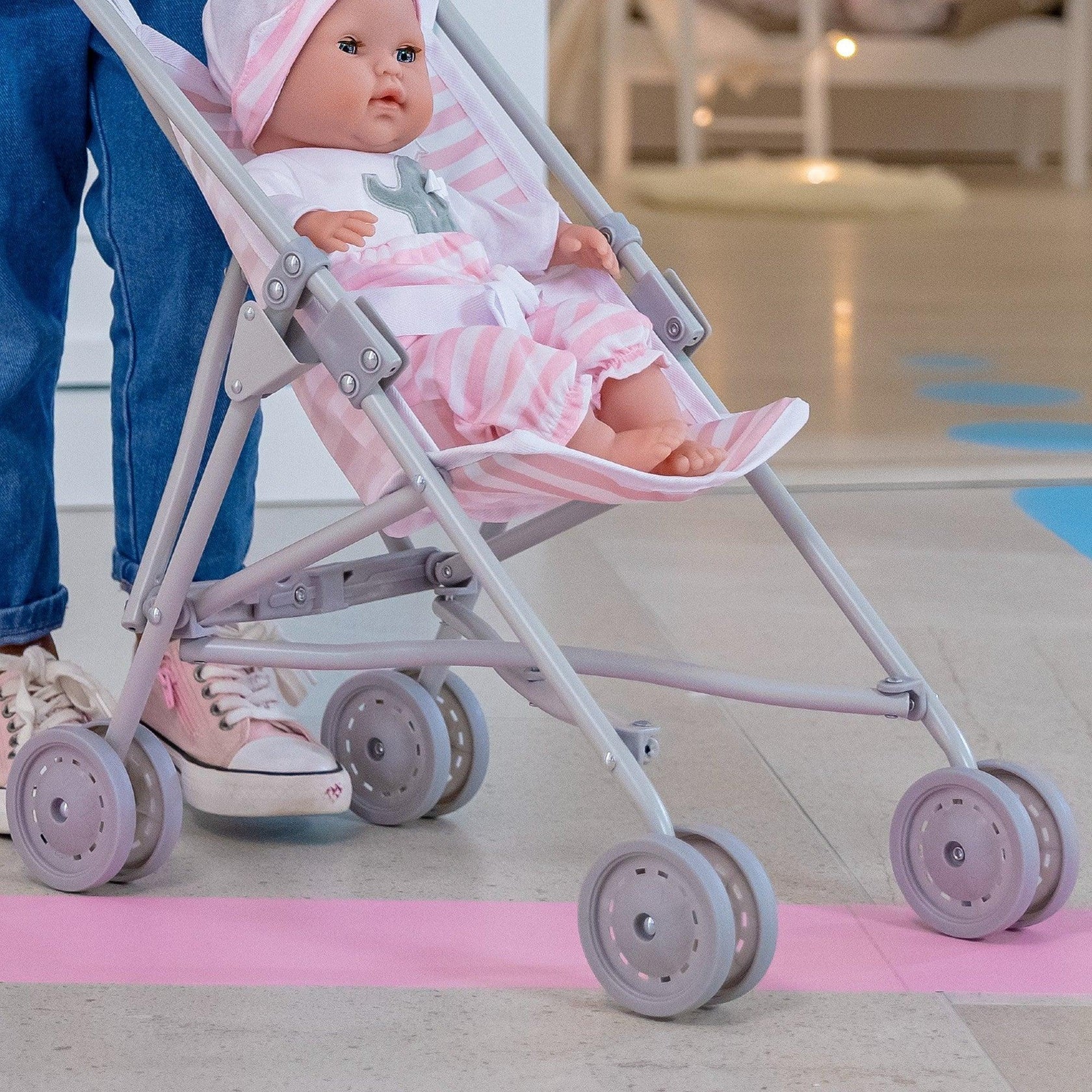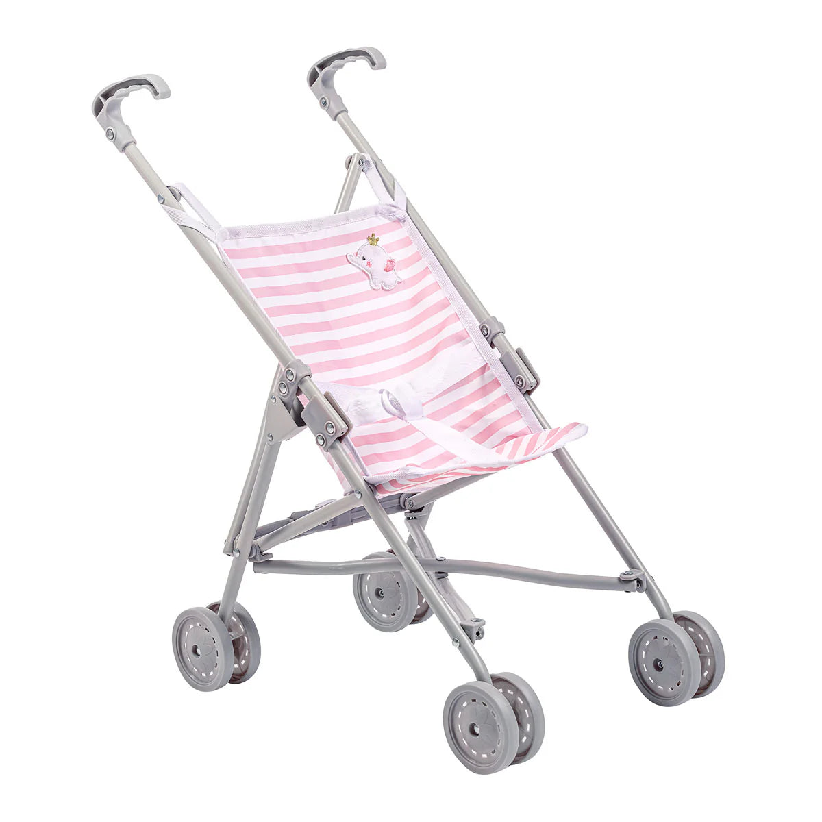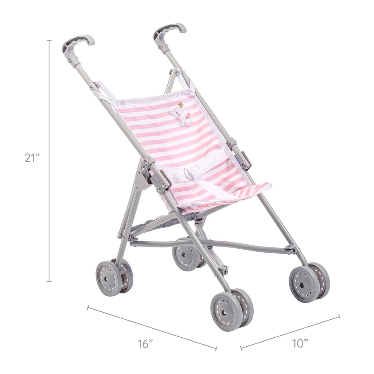 PINK FOLDING SINGLE STROLLER // Elegantly Designed with Grey Frame and Pink and White Striped Seat with embroidered Boutique Accent and doll strap.