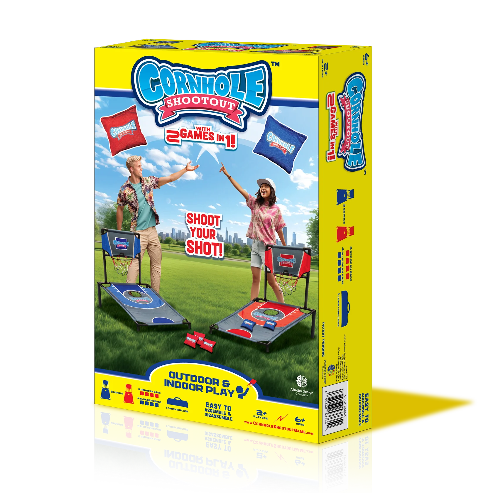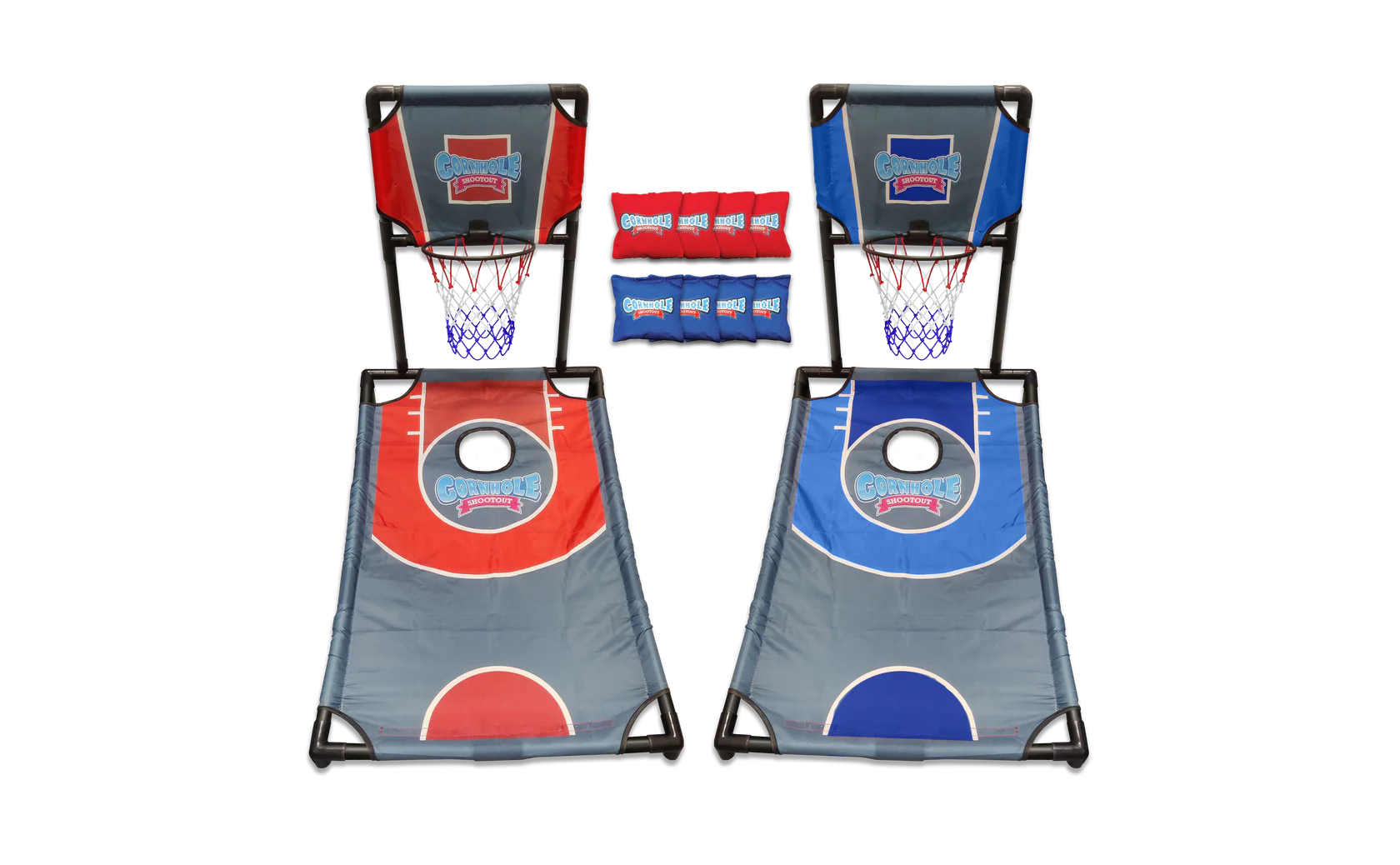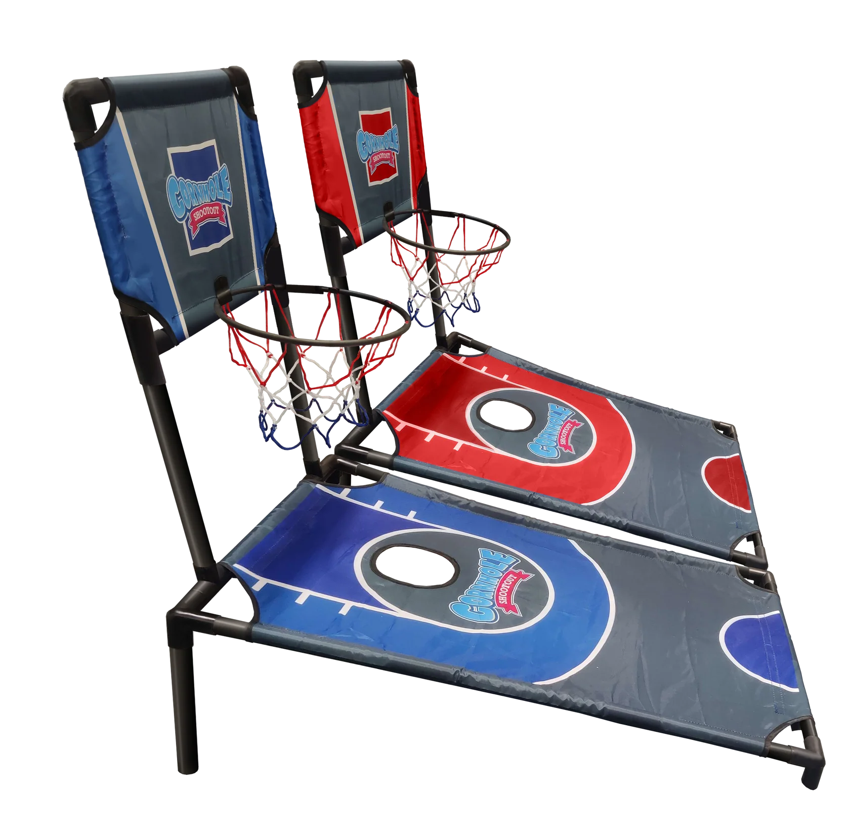 A thrilling fusion of Basketball and Cornhole! Take aim and shoot into elevated hoops, strategically placed on a Cornhole-style board. Score points by sinking shots while outmaneuvering opponents. With precision and teamwork dominate the court and the board in this unique twist onto classic games!