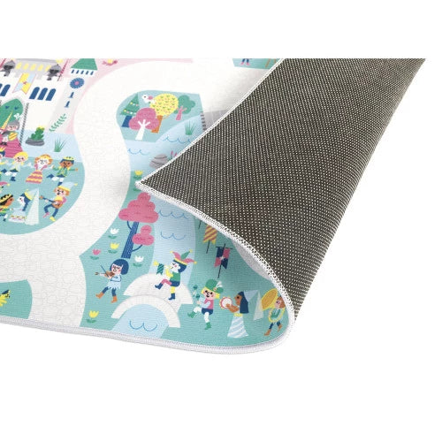 Discover the enchanted kingdom! The magic of fables comes to life in this fantastic, tangy setting! This Princess, Princes, Dragons and Knights playmat is suitable for children aged 2 and over. It has a wide, long road to discover every corner of the kingdom and imagine endless stories! On their play mat with circuit, little ones have fun crossing bridges and paths in search of hidden elements, like a search and find game. They'll spot where the king's trumpet is, the unicorns galloping across the pink plain, and keep an eye out for the strange wizard preparing a potion in the forest... There are so many buildings, musical instruments and fairytale characters represented! We pay a courtesy call on the troll who lives near the tree house, then head off to watch the jousting tournament, before heading to the market to stock up on magical ingredients. With their fabric play mat, children develop their imagination and vocabulary, as well as their sense of observation. Little ones can even discover emotions and numbers! Another plus for this children's play mat: it's non-slip! Perfect for rolling toy cars on, or simply for little ones who like to keep on the move. In its 120 x 78 cm format, this children's bedroom mat offers other play possibilities with its accessories (sold separately): it can be completed with a range of vehicles and wooden blocks, also from our Cross Roads range. You can also link this Enchanted Kingdom mat with other mats in the collection, to create a giant play area and extend children's adventures. In fact, the circuits are designed to link up on all 4 sides of the mat. Why not spend the evening in the fairy forest to round off the day in style?