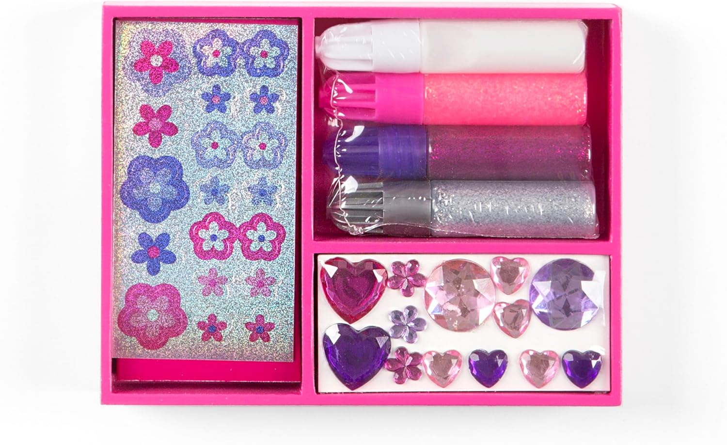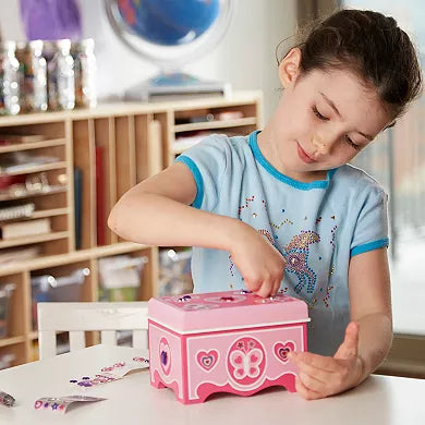 Includes wooden jewelry box, 26 gem stickers, 38 foil stickers, 3 glitter glues, and white glue
