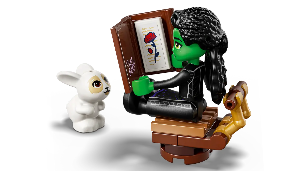 This building toy for kids is packed with details to spark imaginative play. Wicked movie fans will recognize the poppy Fiyero gives to Elphaba pressed inside Glinda’s book. As they set up tea and cups and settle in around the fireplace, storing the Grimmerie away safely in the desk.