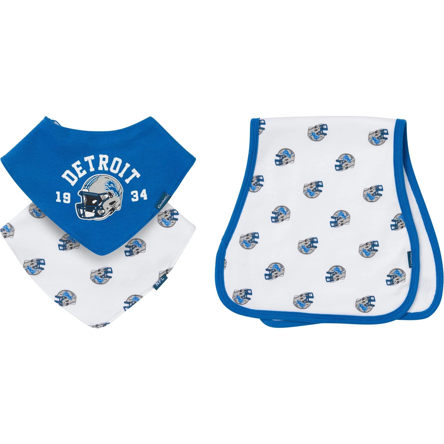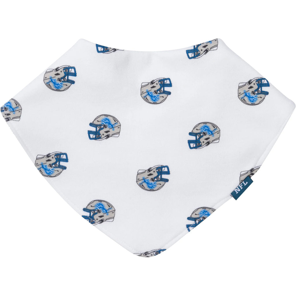 Show off some Detroit pride at mealtime with this 3-piece bib and burp cloth set! It includes two soft, absorbent bandana bibs and one generously sized burp cloth, perfect for catching dribbles, drool, and spit-up. The bibs snap securely in place to stay put, while the large burp cloth ensures that parents stay clean during feedings. A must-have gift for any Lions fan who wants their little one to cheer on the team in style. Our essentials are independently certified with STANDARD 100 by OEKO-TEX, so you don’t have to worry about harmful substances in your little one's wardrobe. Includes two bandana bibs and one burp cloth.