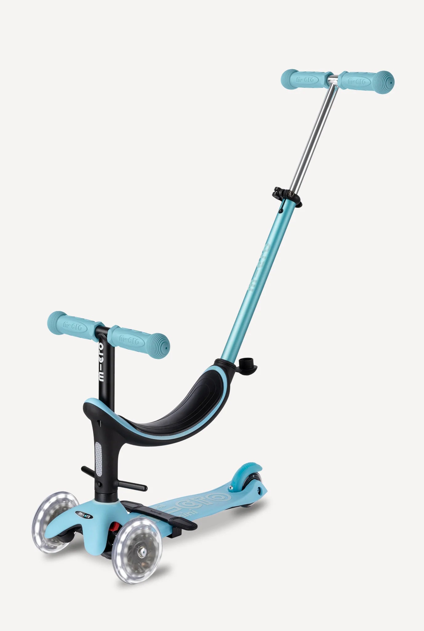 The innovative and ergonomic all-in-one scooter can be used in four different variations: at the very beginning with seat, two footrest options, and push bar for the parents; later on without the parent’s push bar, as a mix between balance bike & scooter; as a starter scooter for young riders; and finally as a classic Micro Mini Deluxe Scooter with Magic LED light bulbs on the adjustable handlebar, plus LED wheels.