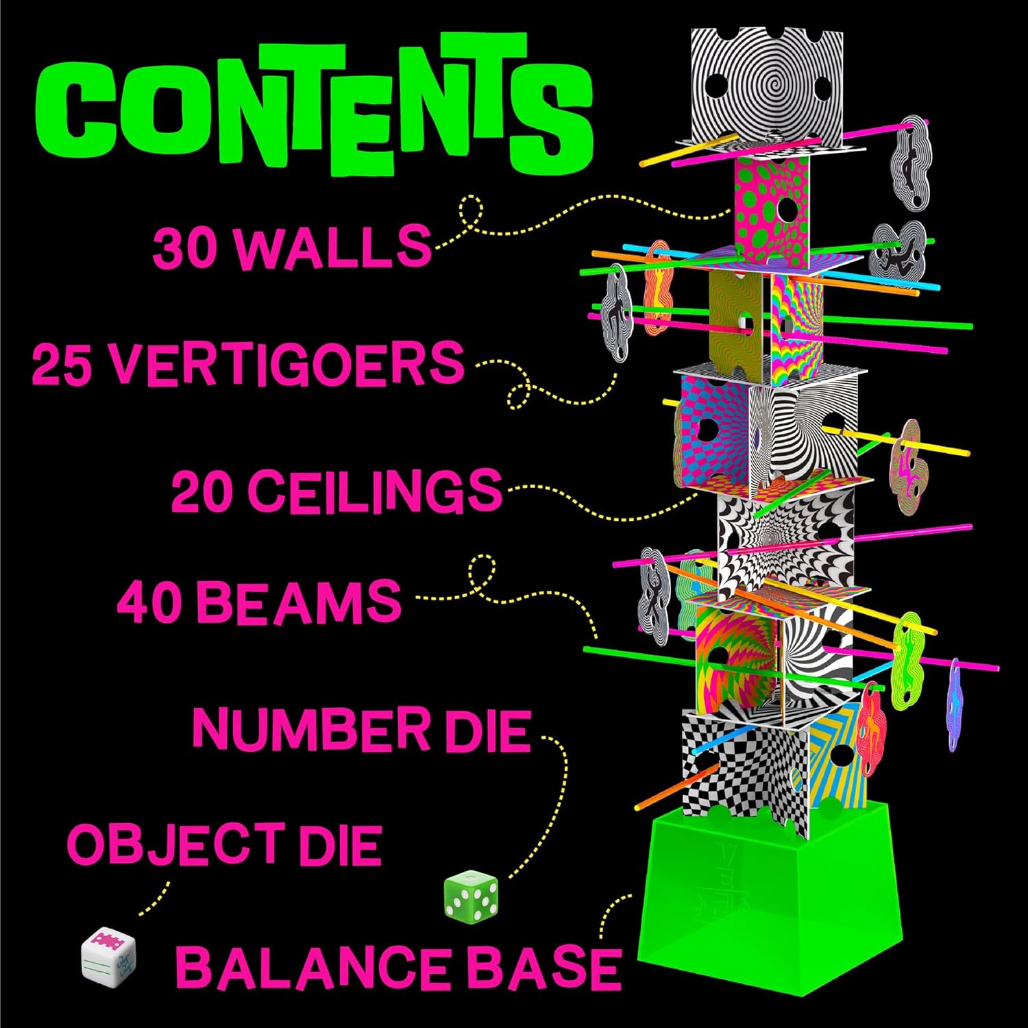 • Includes 30 walls, 20 ceilings, 25 Vertigoers, 20 beams, a balance base, object die, number die, and game rules
