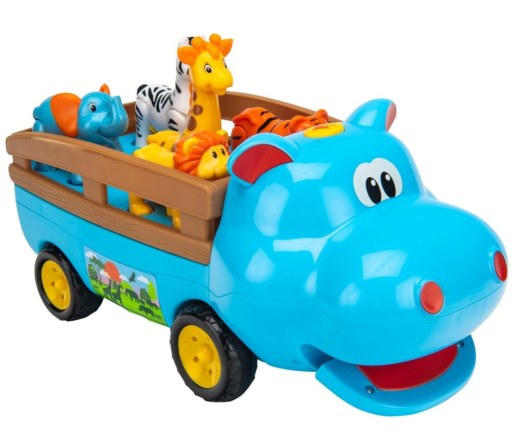 The free-wheeling hippo is a load of fun with 5 removable animals: tiger, lion, giraffe, elephant, and zebra! Hear funny hippo sounds and learn about jungle animals as each animal plays realistic animal sounds when they are placed on the truck. Rock and Ride on your favorite jungle animals as they play real animal sounds and lively music. Safe and sturdy construction for hours of riding fun!