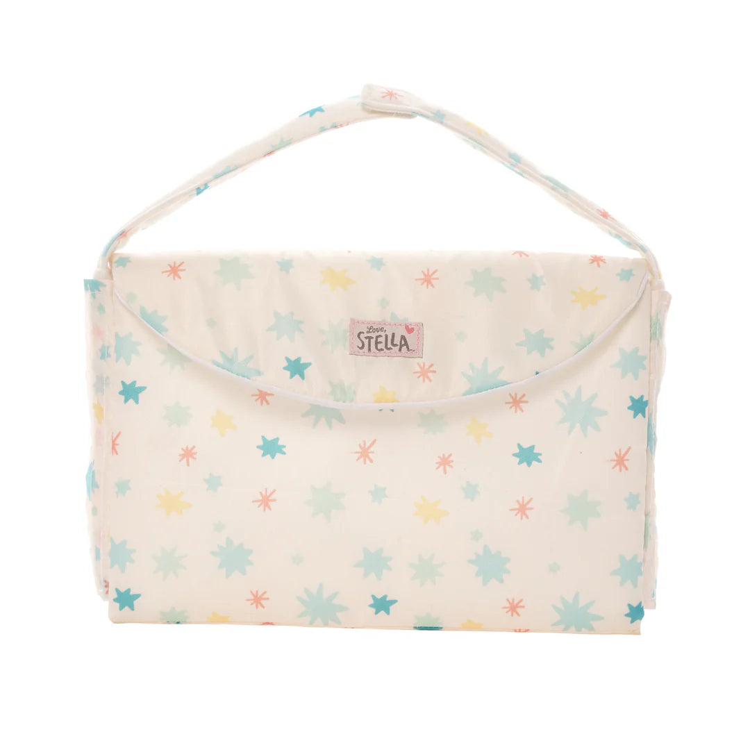 Diaper changing is a breeze with this delightful diaper bag set. Soft doll diaper changing set includes a convertible diaper bag that folds open to a soft changing mat, a diaper, 3 wipes in holder, and a diaper cream tube. Doll sold separately.