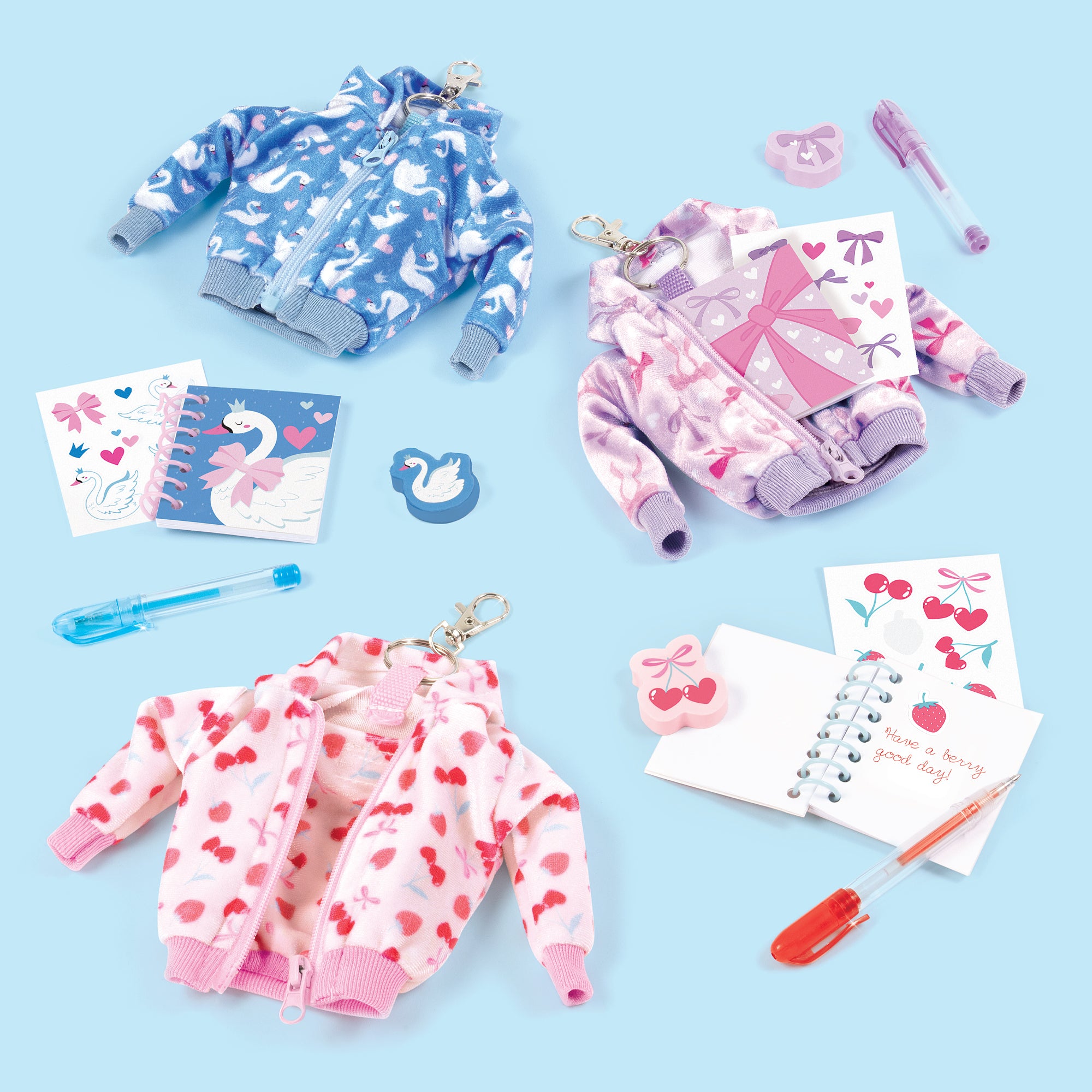 Mini fabric hoodies unzip to reveal a pocket with fun-size stationery: a notebook, marker, sticker sheet, eraser and bag clip to take it all to go! Bonus: the hoodie fits 11.5” fashion dolls (and similar sized, super-trendy furry friends) for a fab playtime crossover event!