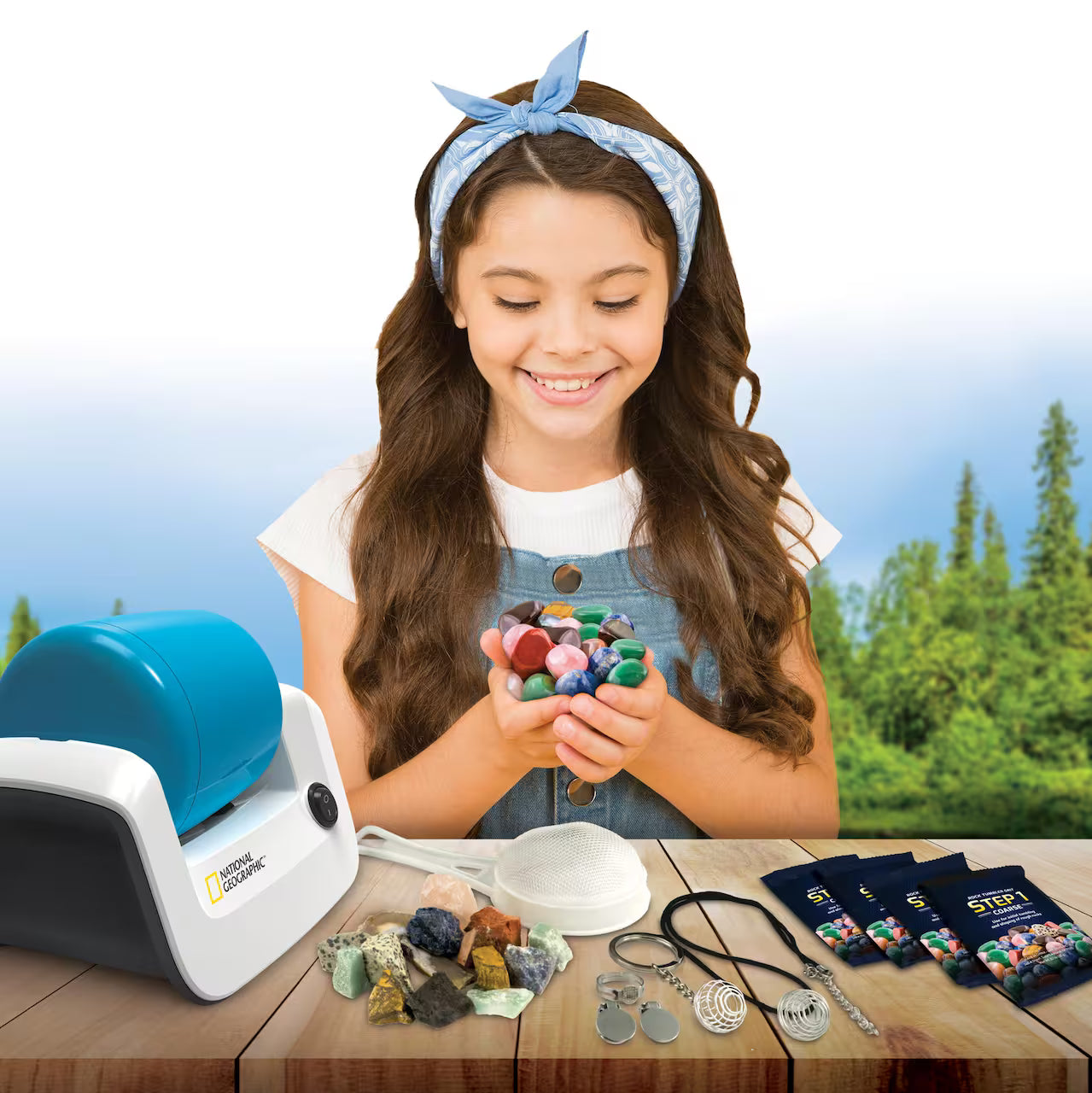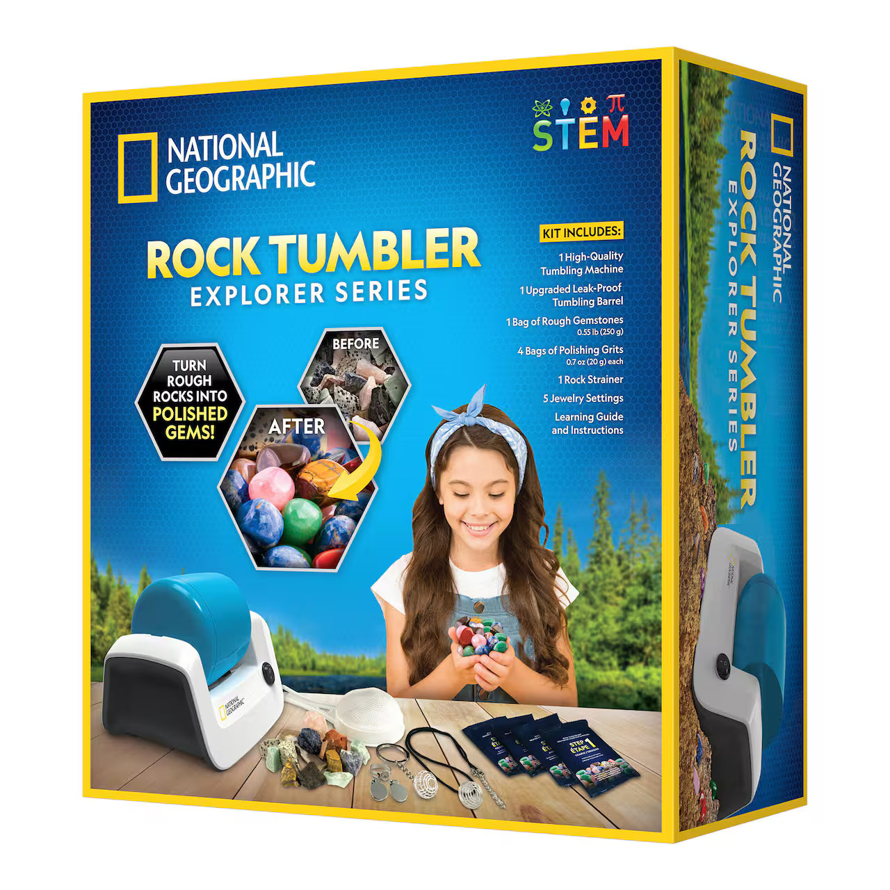 The National Geographic Hobby Rock Tumbler Kit is a complete rock polishing kit that allows your child or teen to turn rough rocks into gemstones, making it a perfect introduction to Geology and Earth Sciences. Tumbler kit by National Geographic includes one pound of rough gemstones, eight packets of polishing grit, a storage pouch, and five jewelry fastenings. The tumbler base and motor are built to last and the tumbler barrel is designed to be low noise and leak proof. It has a built in timer and automatic shut off switch too. Now your kids can create beautiful keepsakes from your favorite specimens.