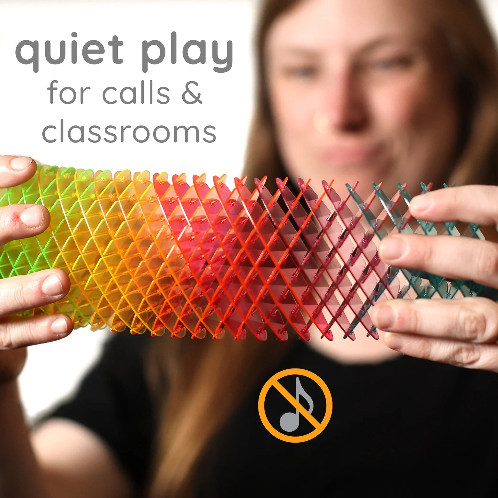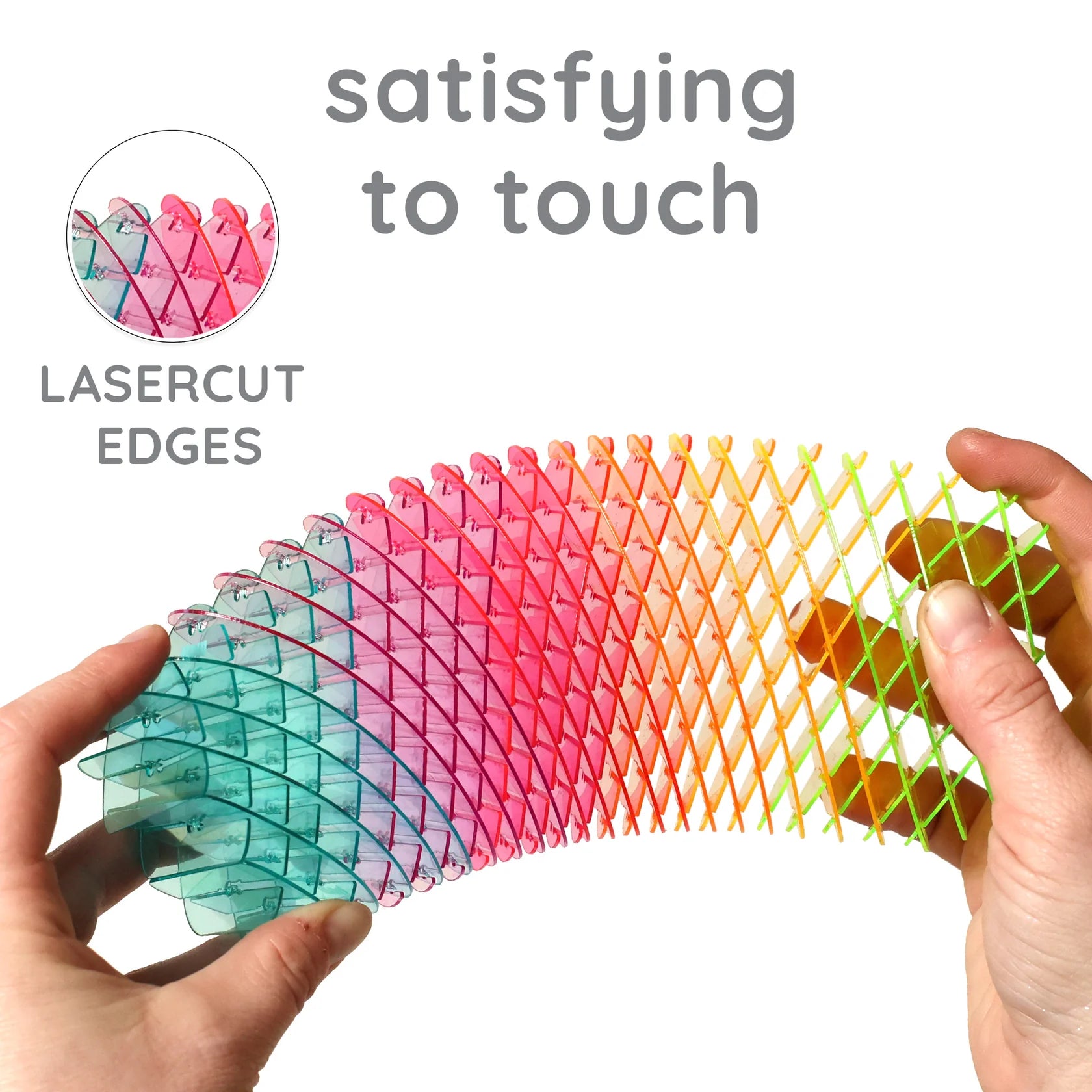 A delightfully bendy fidget spring that bounces and boings in heavenly elasticity. Dribble it. Bobble it from hand to hand, or launch it in the air and watch it contort in boundless, squishy joy.