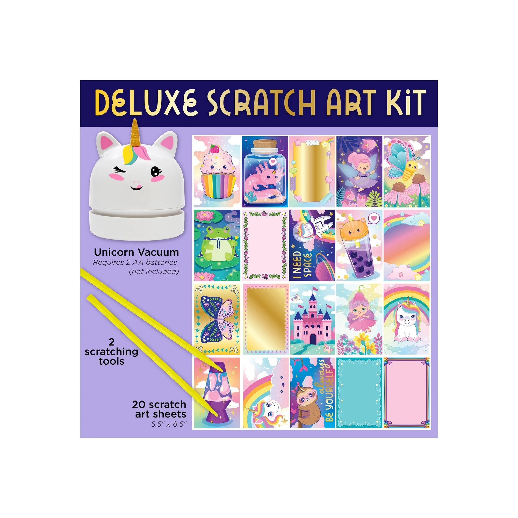 Contents Include: Unicorn Vacuum, 20 Scratch Art Sheets, 2 Scratching Tools and Instructions