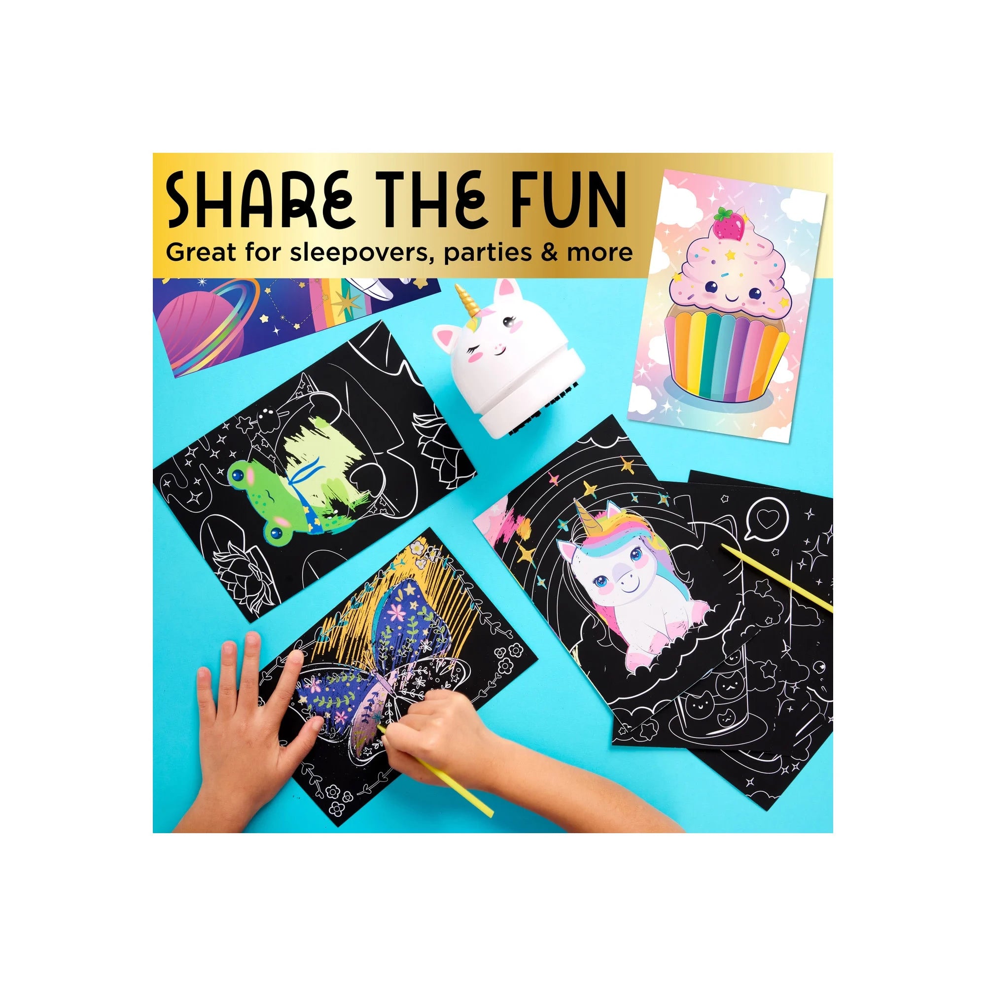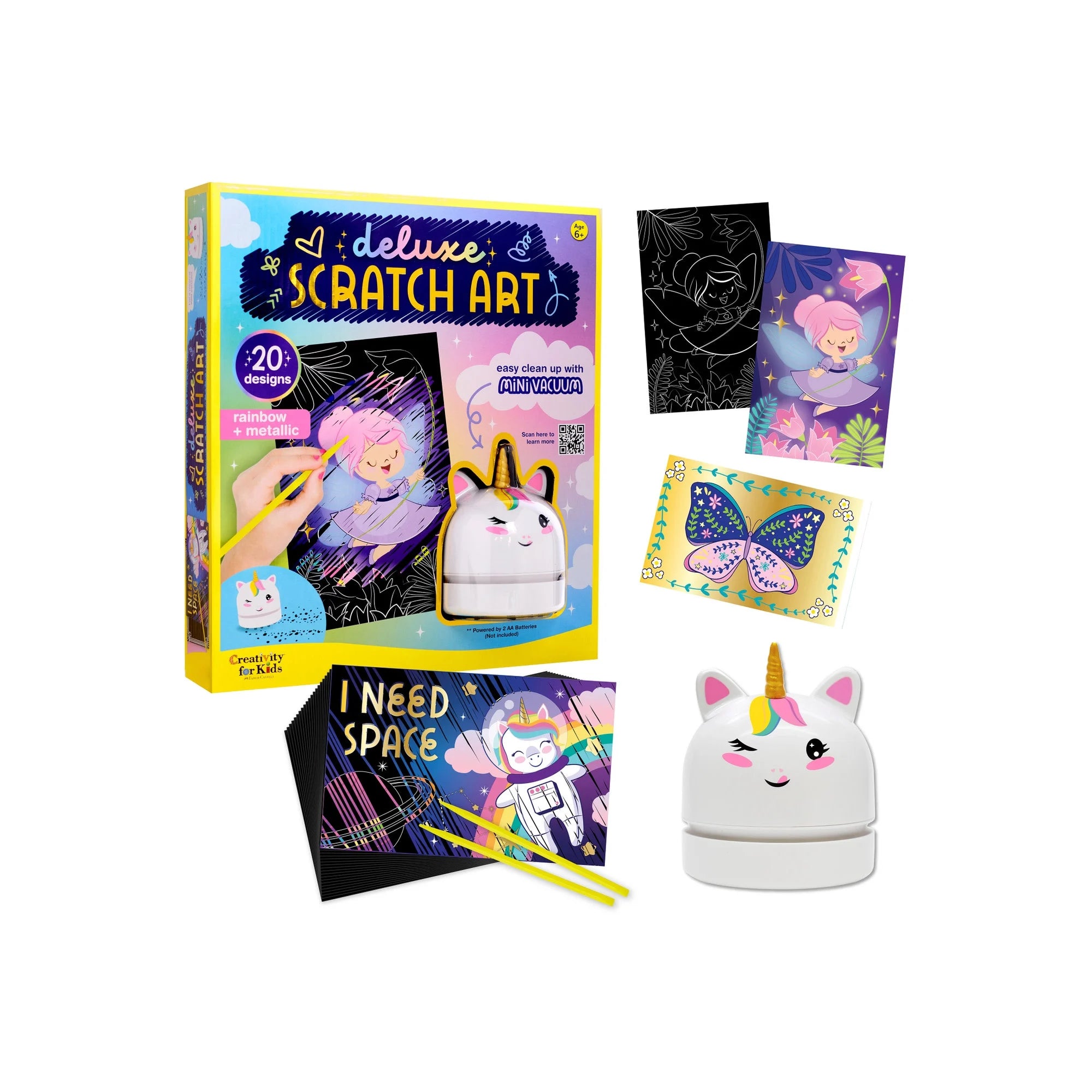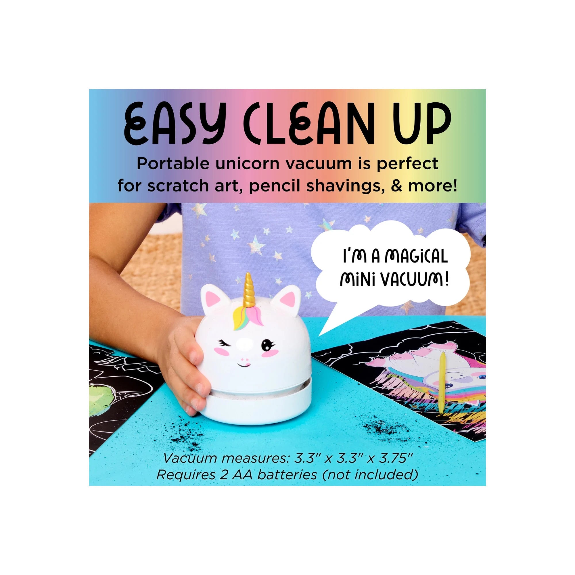 Less mess, more fun! This ultimate scratch art kit includes a mini Unicorn desk vacuum to sweep your crafting crumbs away!