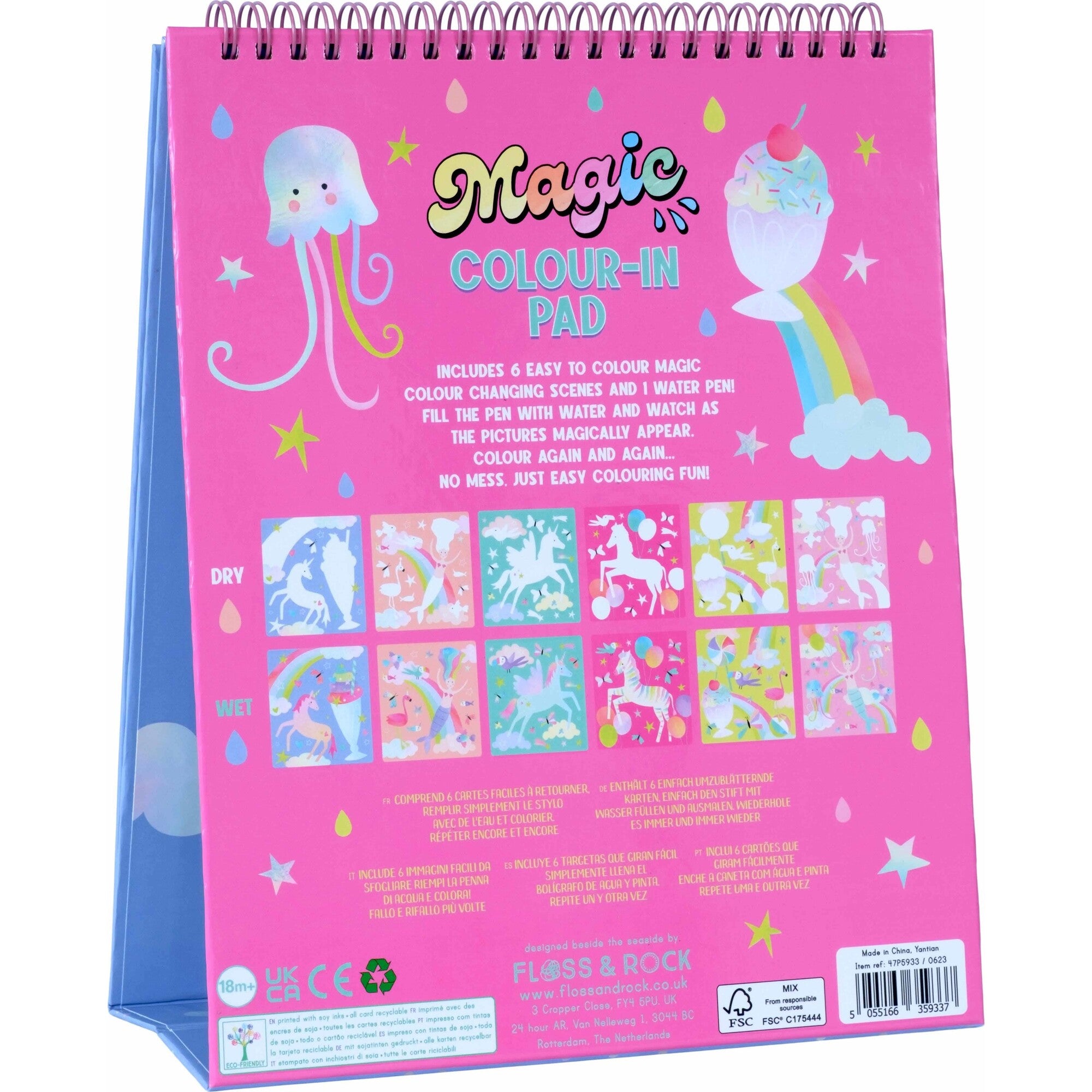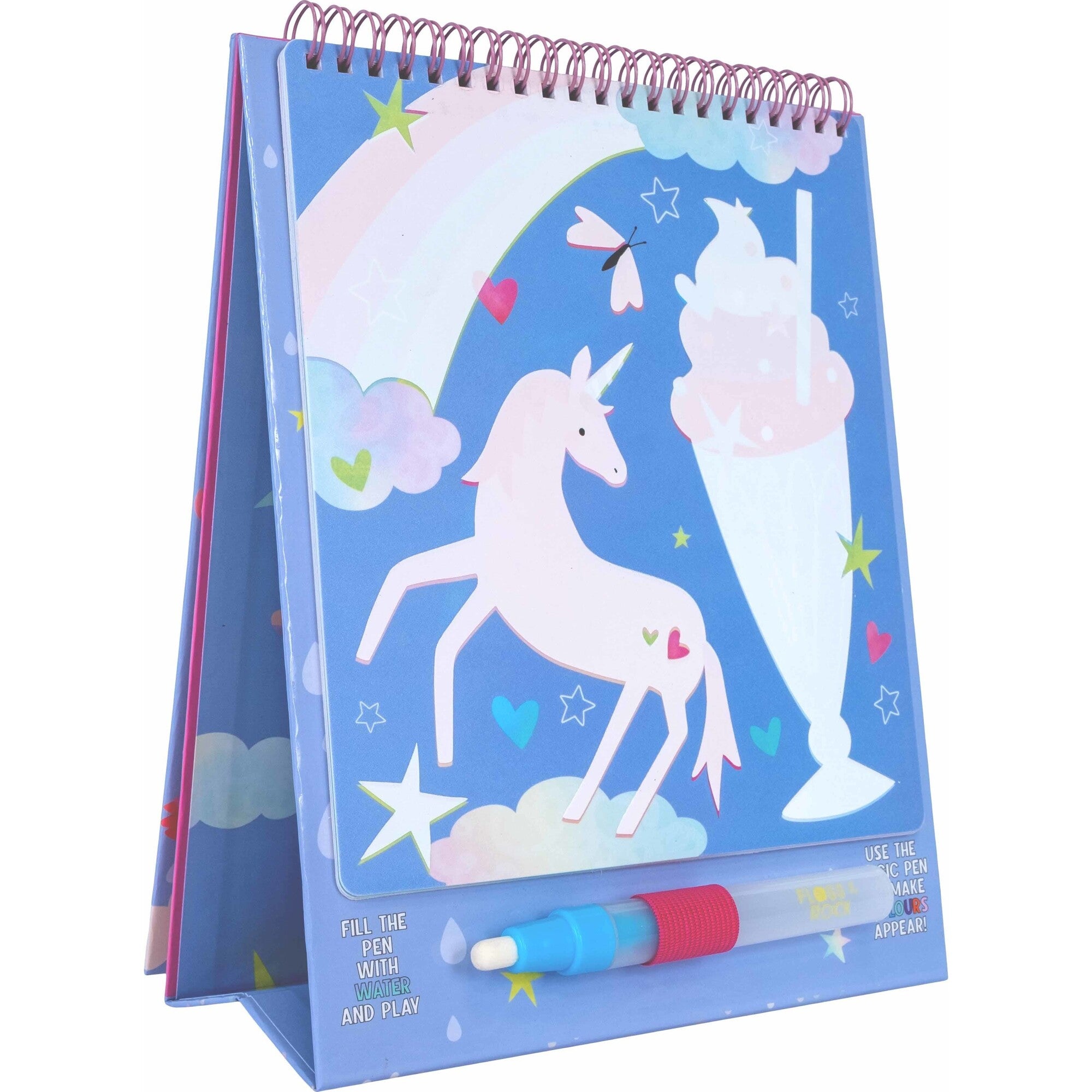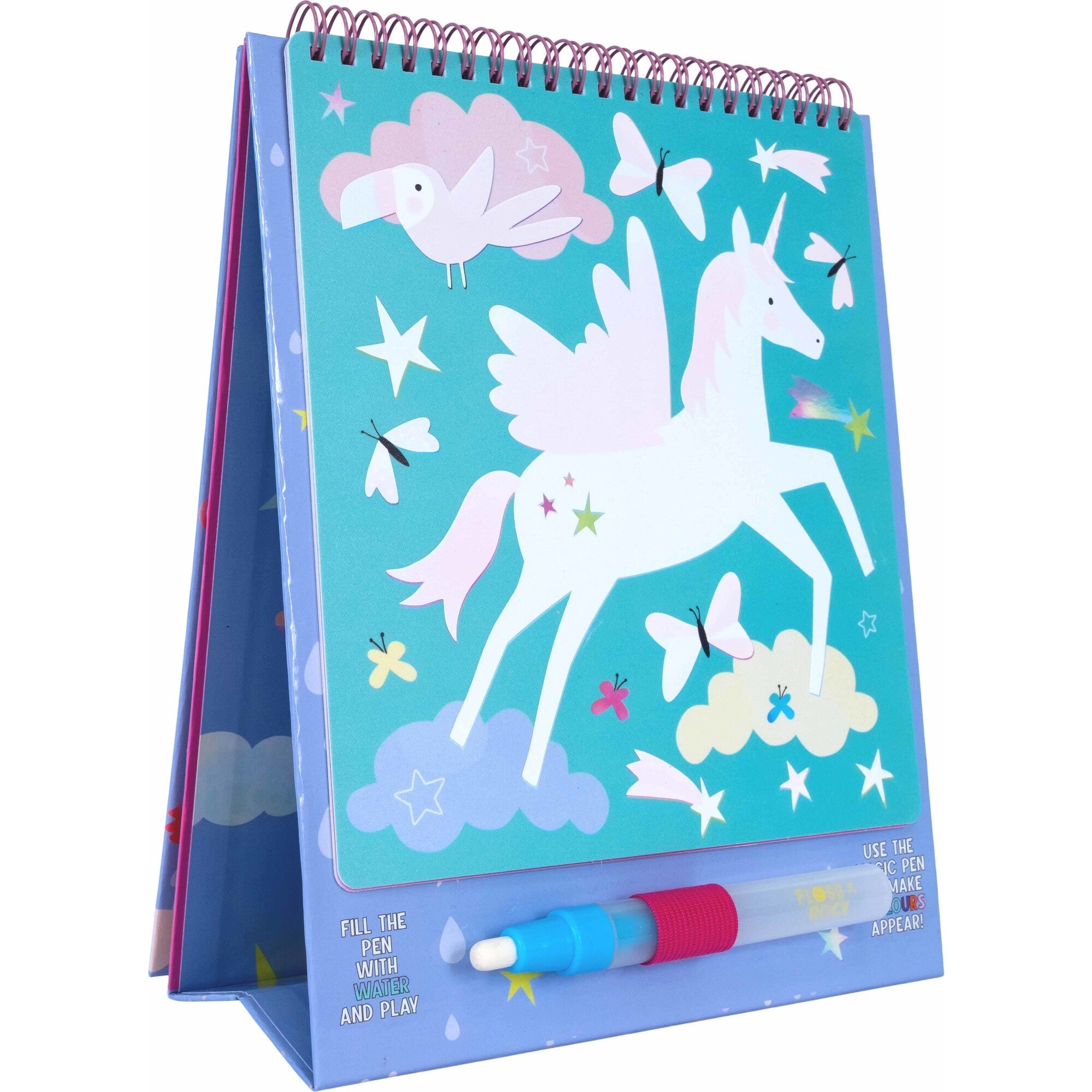 Our Magic Water Easel Pads are so much fun! Like our popular water cards, fill up the pen with water and colour in the designs to see them magically appear, then disappear once dry. The 6 brightly coloured fun sheets are held together in a spiral bound pad allowing you to flip them over once complete. The built-in easel stands the pad up so you can use it like a ‘proper’ artist! The pad is reusable over and over again and you’ll have so much fun revealing the colourful mermaids, unicorns, butterflies and more! Once you’ve finished your creative session, close the pad and secure your special water pen in the elastic closure to keep it nice and safe. This portable pad is perfect for taking out and about (and you don’t have to worry about any mess either!)