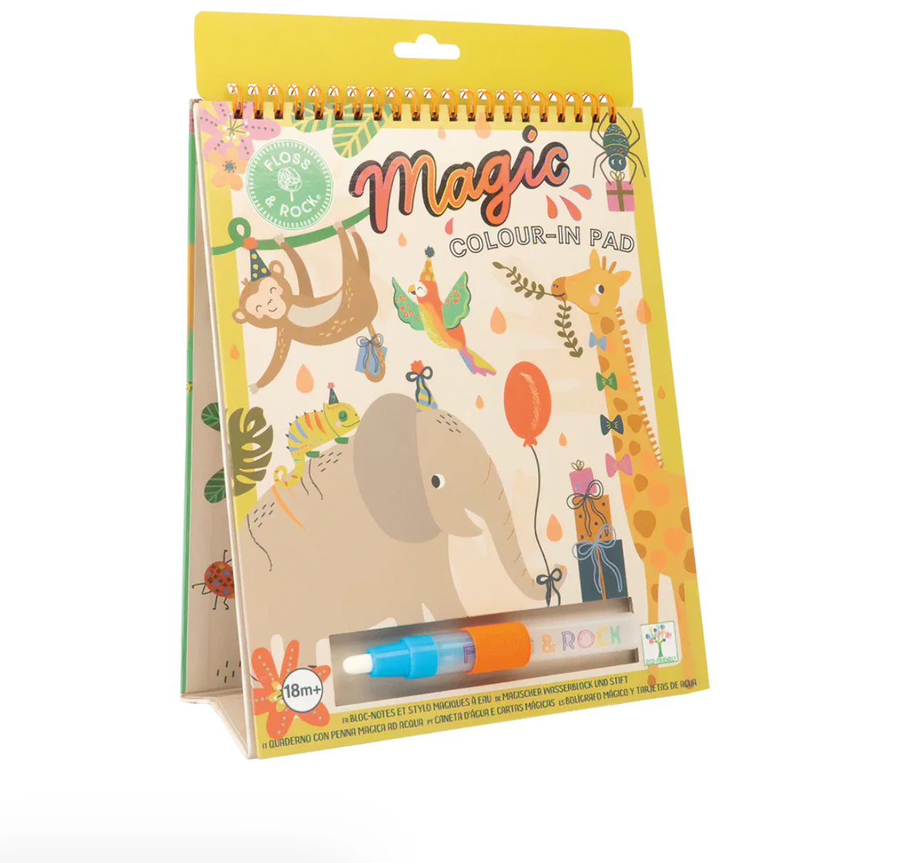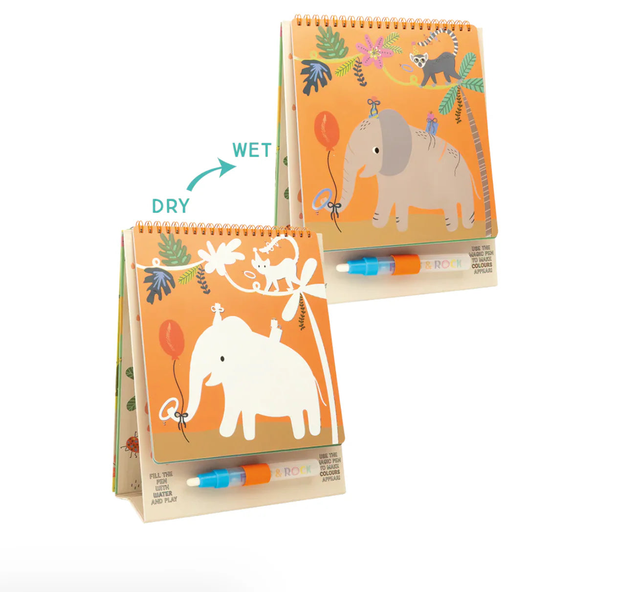 Our Magic Water Easel Pads are so much fun! Like our popular water cards, fill up the pen with water and colour in the designs to see them magically appear, then disappear once dry. The 6 brightly coloured fun sheets are held together in a spiral bound pad allowing you to flip them over once complete. The built-in easel stands the pad up so you can use it like a ‘proper’ artist! The pad is reusable over and over again and you’ll have so much fun revealing the colourful and super fun Jungle friends! Once you’ve finished your creative session, close the pad and secure your special water pen in the elastic closure to keep it nice and safe. This portable pad is perfect for taking out and about (and you don’t have to worry about any mess either!)