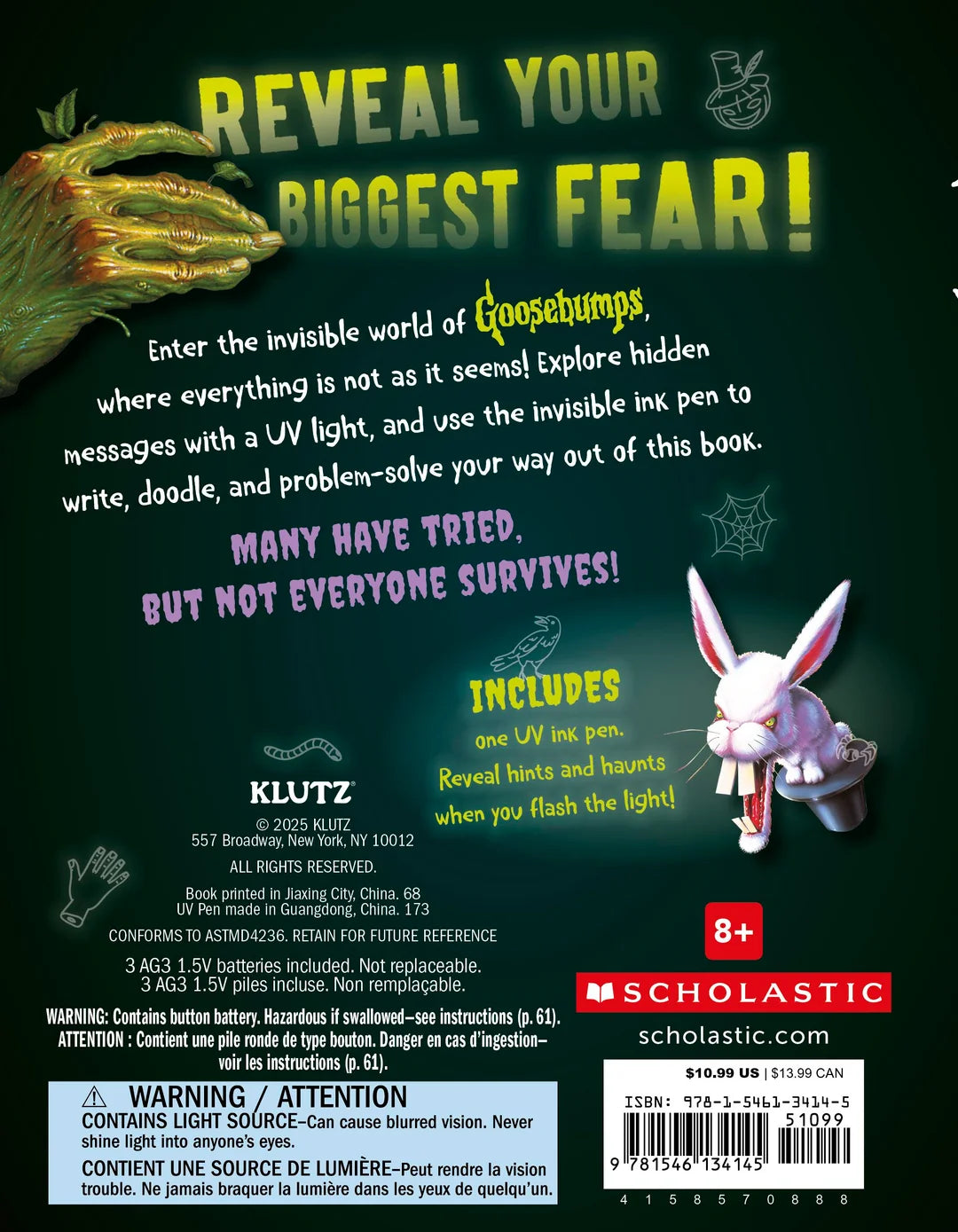 Appearances can be deceiving. . . and dangerous! Reveal the hidden mysteries in this chilling Goosebumps activity book, with invisible ink. The pages are jam-packed with mysterious messages, spooky secret codes, terrifying trivia, and games inspired by classic Goosebumps characters, icons, and places, including Slappy, the Haunted Mask, HorrorLand, and many more! Shine the included UV light to find hints and clues along the way as you solve puzzles, and use the invisible ink pen to doodle and write in the blanks. Equal parts scary and silly, this book will have readers shrieking with both fear and delight!