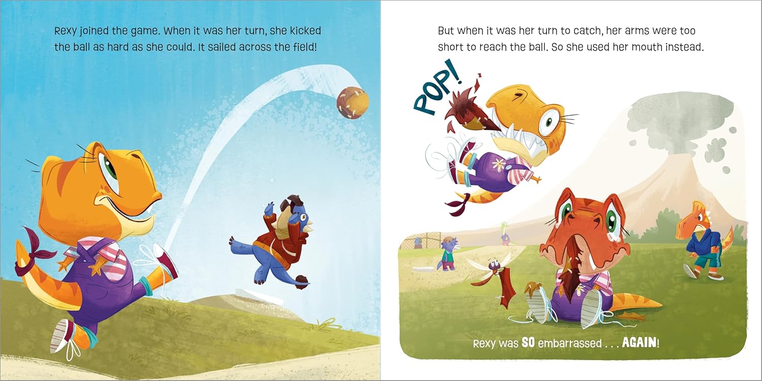 Rexy is nervous about starting school. Her head is BIG. Her arms are small. And her teeth are the size of bananas! Rexy wants to fit in with the other dinosaurs, but after catching a kickball in her mouth (and popping the ball!) at recess, she's MORTIFIED and ready to give up. Then a volcano erupts, sending rocks flying onto the kickball field. When another dino needs help, can Rexi's powerful jaws save the day? You bet your tyrannosaur they can!