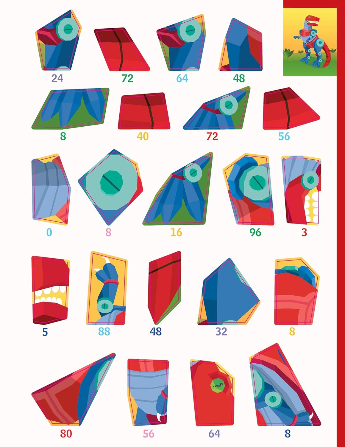 In Learn by Sticker: Multiplication, solve third grade-level multiplication problems and use the answers to determine where to place each sticker to create ten sticker images of supercool robots. Plus, the back of each sticker page contains fun, critical thinking-based math activities like solving riddles, exploring mazes, and more.