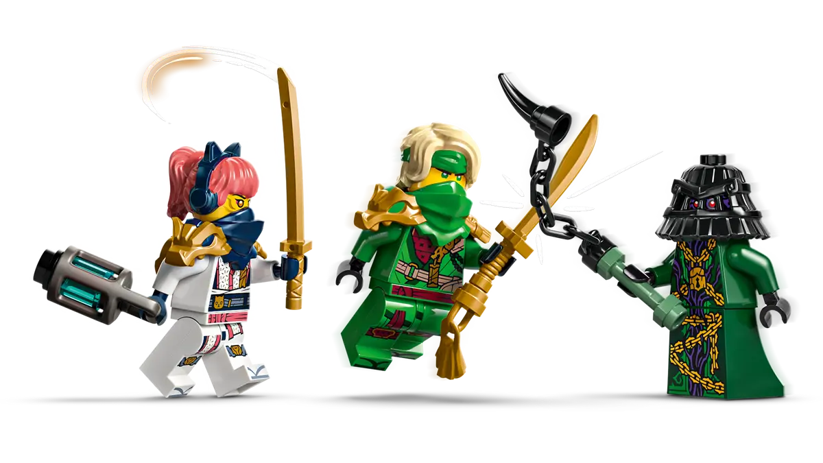 4 NINJAGO minifigures are included in the LEGO playset: ninja warriors Lloyd, Sora and Wyldfyre, each with a ninja weapon accessory, plus Master of Misfortune, Zarkt, for kids to play out epic good vs. evil battles. There is also a brick-built mini shrine with a secret message that Lloyd reveals with his translucent reveal blade accessory.