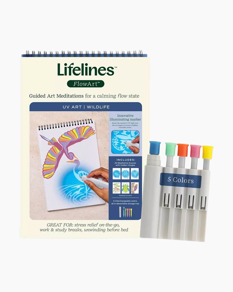Comes with 20 meditative scenes and innovative illuminating marker with 5 interchangeable colors, all in a detachable storage tray.