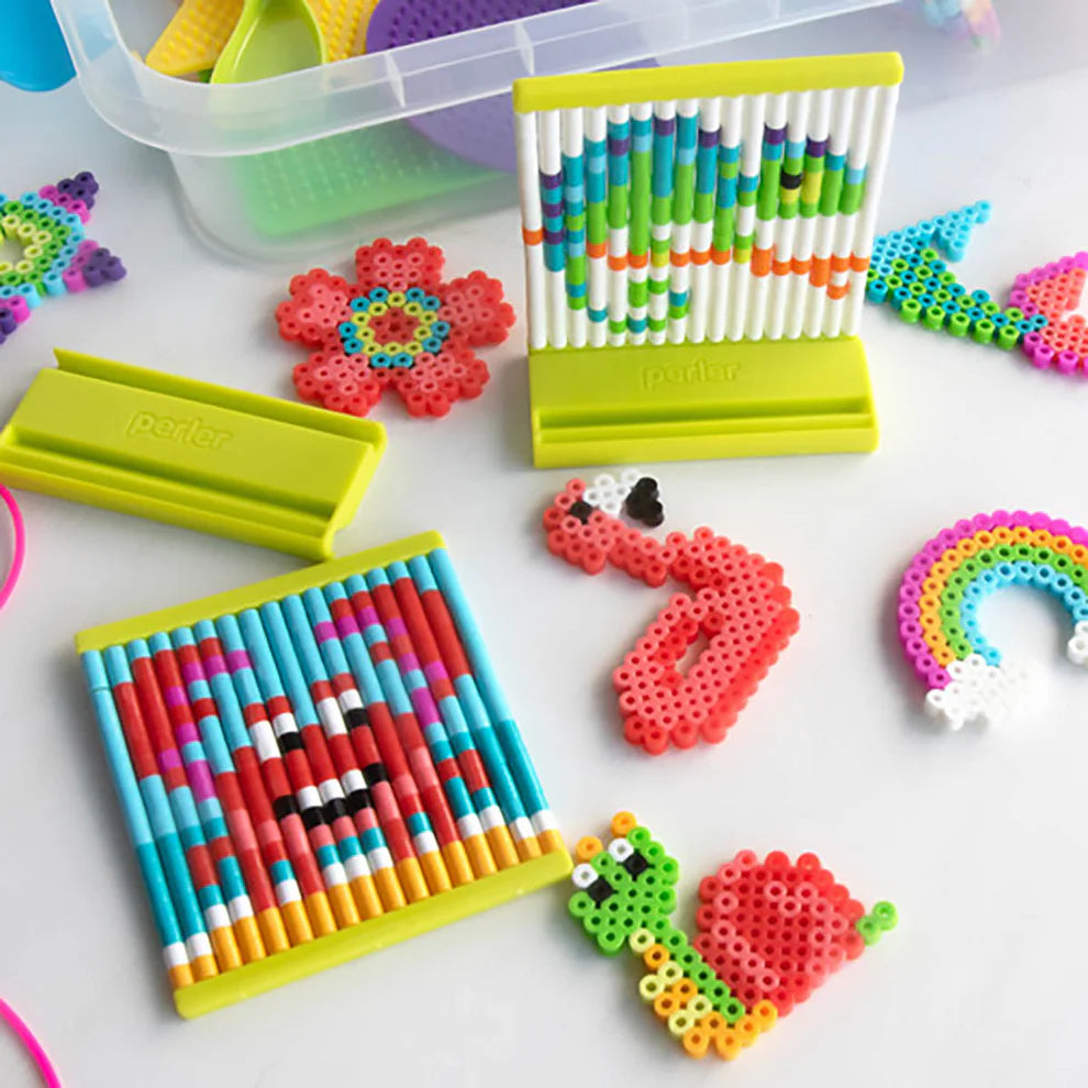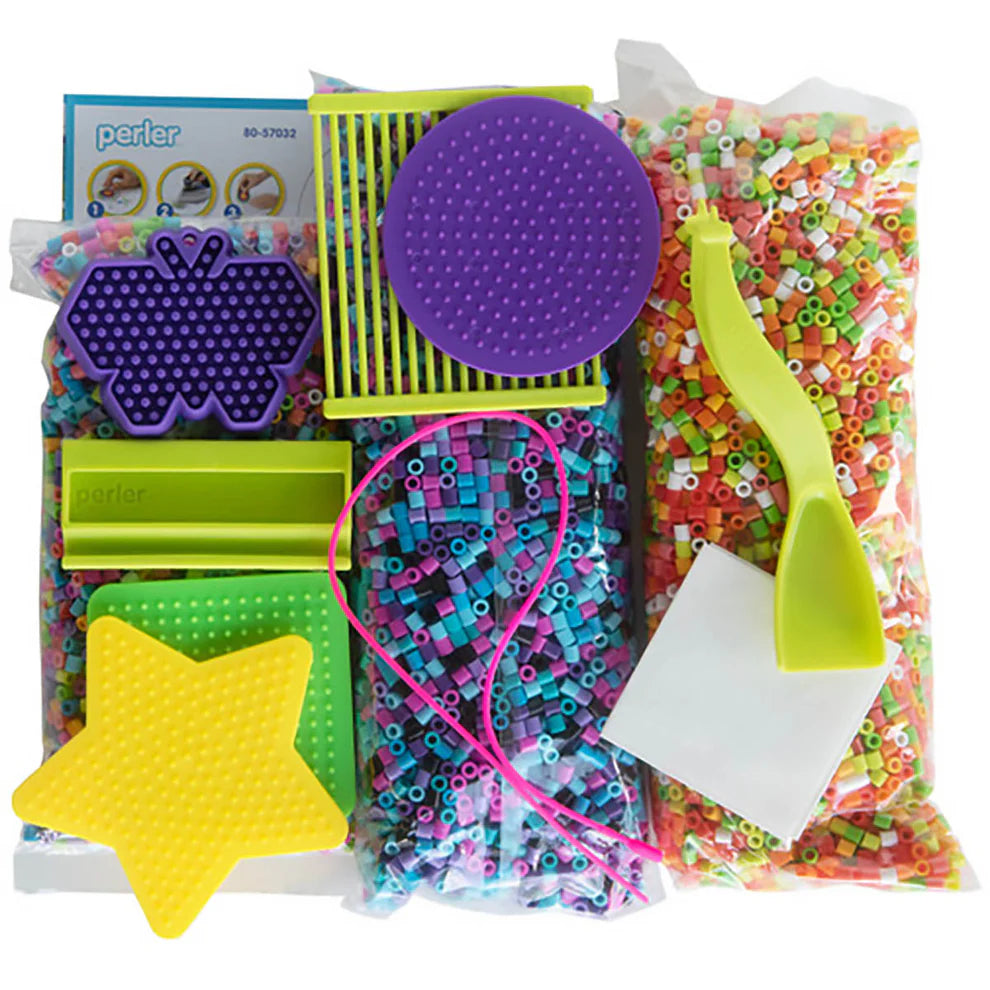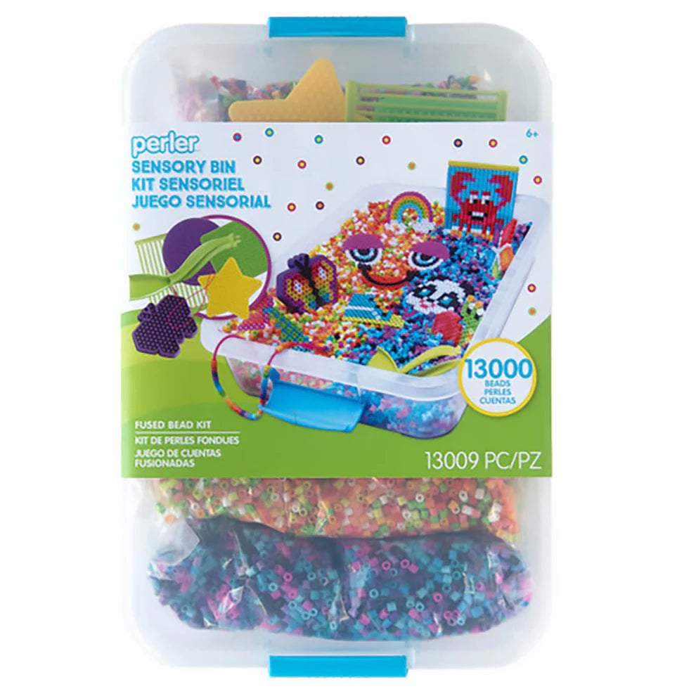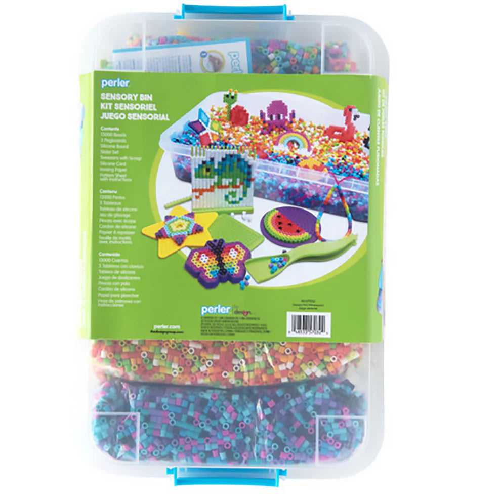This Sensory Bin kit from Perler provides the opportunity to explore and learn through tactile play that engages the senses. Loads of patterns are included to create colorful bead designs that help promote fine motor skills, creativity, counting skills, and color recognition. Designed for ages 6 and up. Kit contains 13000 beads, 3 pegboards (small square, small circle, star), silicone board, slider set, tweezers with scoop, silicone cord, pattern sheet with instructions, and ironing paper, all packaged in a plastic bin with locking lid. Ironing to be done by an adult only. Overall bin size with lid, 15" x 9.875" x 3".