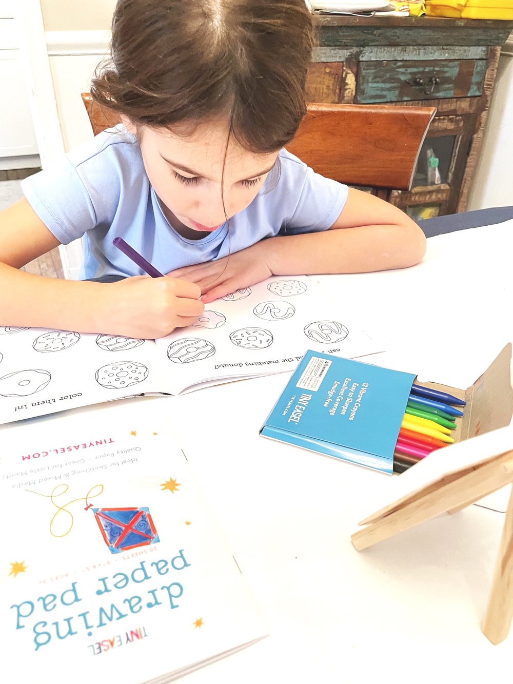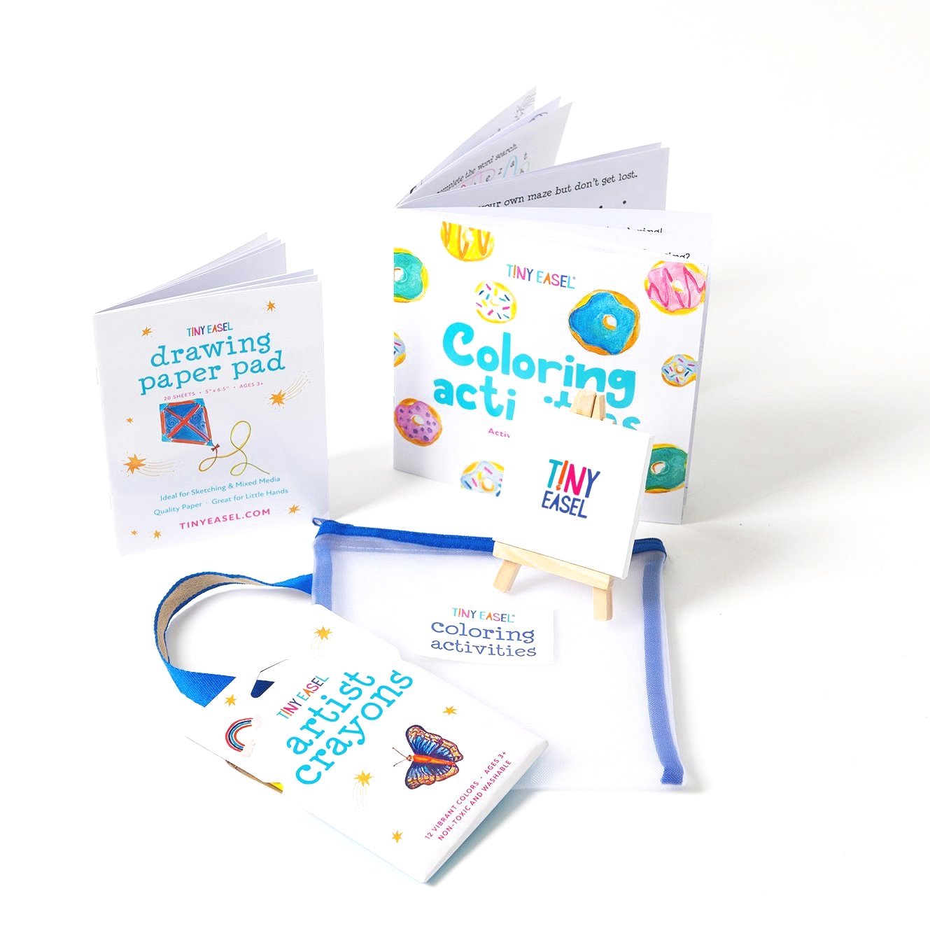 Tiny but oh-so-necessary art kits for busy kids on-the-go. Great for taking out to a restaurant to occupy your kids and spark their imagination with our NEW artist crayons and NEW coloring book! Includes a coloring activity book, 12 vibrant, washable and toxic-free crayons, a drawing pad and … a TINY easel all tucked in an easy carrying bag to color-n-go.