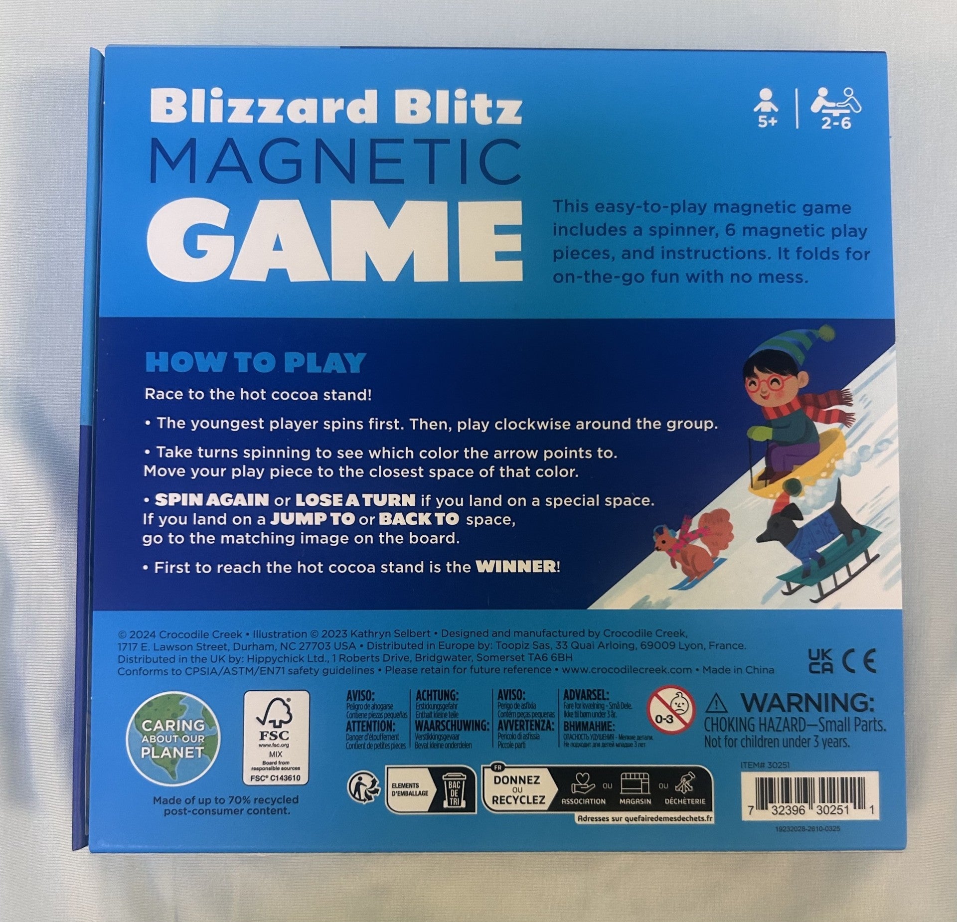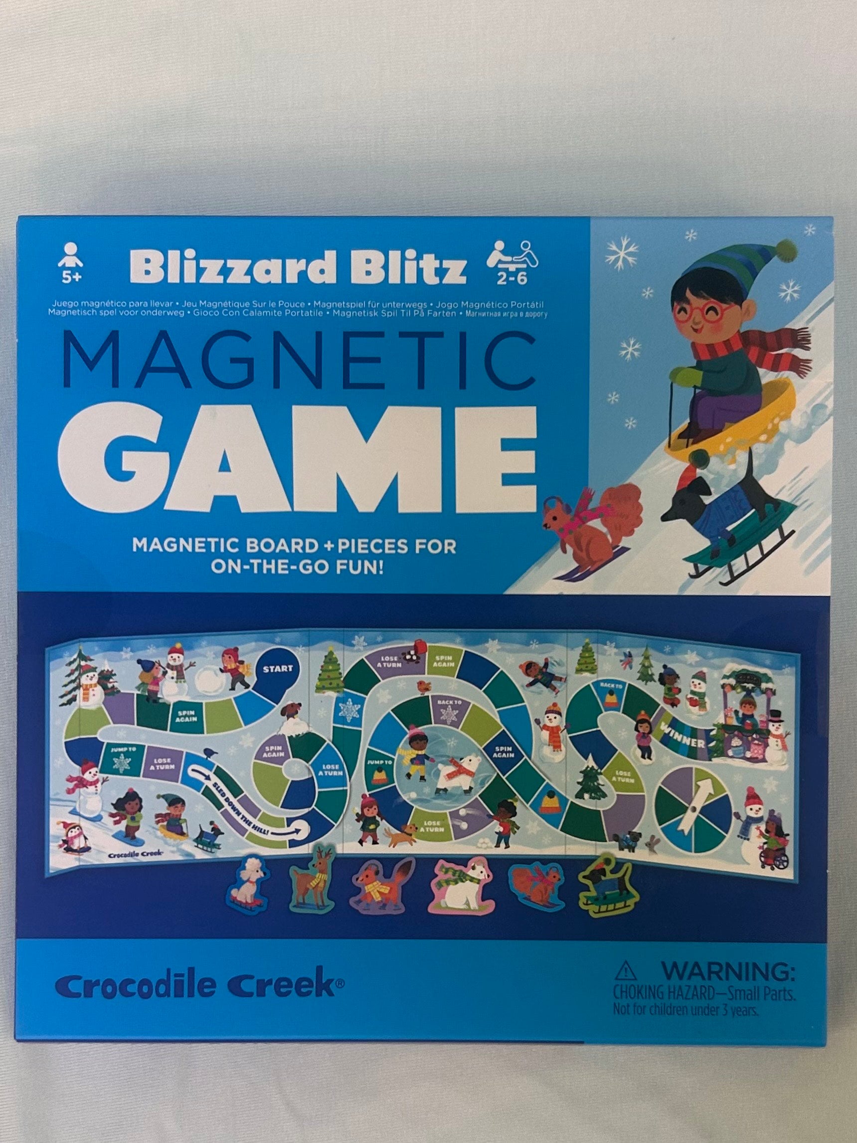 This easy-to-play magnetic game includes a spinner, 6 magnetic pieces, and instructions. It folds for on-the-go fun with no mess.