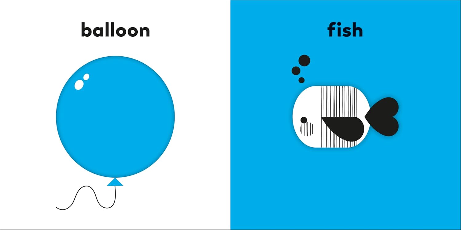 Filled with features to stimulate a baby’s senses, this high-contrast black, white, and blue book is full of raised pictures to touch, a peep-through cover, and a mirror.