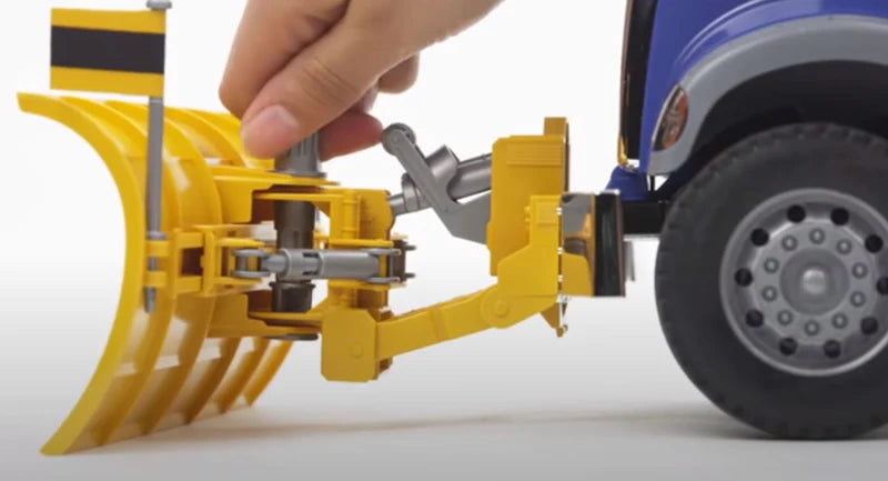 The "unbelievably" realistic driver's cab with opening doors, a tilting hood that allows a view of the engine block, folding rearview mirrors, and numerous chrome-effect attachments is a real eye-catcher, and not just for trucking enthusiasts. The hydraulics allow the dump truck to be tilted, and the tailgate opens. The truck features a wide, height-adjustable and detachable plow blade that manages to clear even the thickest snow and create a lane suitable for traffic. This truck, well-known from road construction, can be used by children both indoors and outdoors. This way, children can learn about the world of adults in a playful way.
