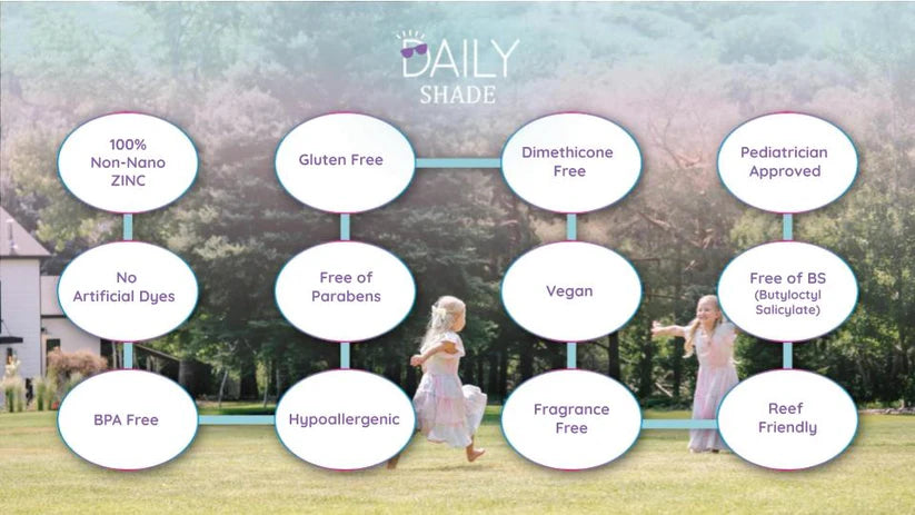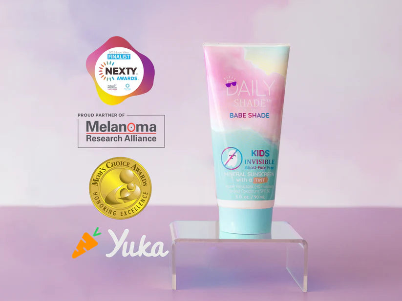 Babe Shade is our Kid's Daily Mineral Sunscreen line that is GHOST-FACE FREE! FINALLY! FINALLY, there is a daily sunscreen safely designed for our kids that actually looks invisible on the skin! With ZERO white cast. Up to 80% of sun damage in a person's life happens BEFORE the age of 18! YOWZA! How did we do it? Many companies are claiming to be natural and clean while hiding ingredients in the inactive list like Butyloctyl Salicylate a known endocrine disruptor. Here at DAILY SHADE when we say our products are designed with safety in mind we really mean it!