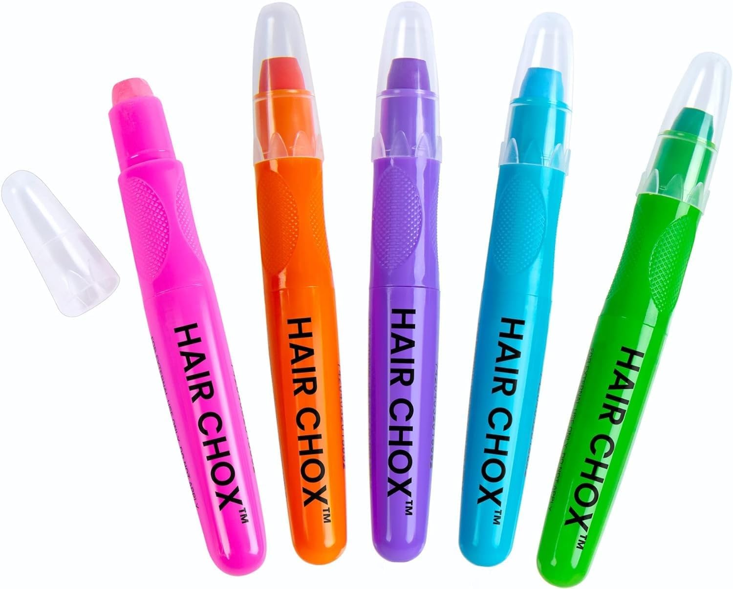 - 5 hair color pens in orange, pink, purple, turquoise and green.