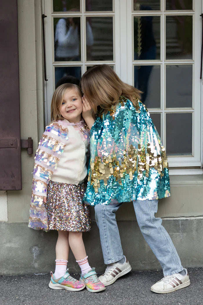 Make a splash in shimmering, show-stopping style with the 5th Avenue Paillette Cape, Mermalicious – where deep sea dreams meet high fashion flair! Designed for little ones who love to dazzle, this luxurious cape features bold stripes of sequins that shimmer and shine with every step. Smaller sapphire-blue paillettes alternate with larger, luminous gold sequins to create a magical, scale-like texture that’s pure mermaid glam.