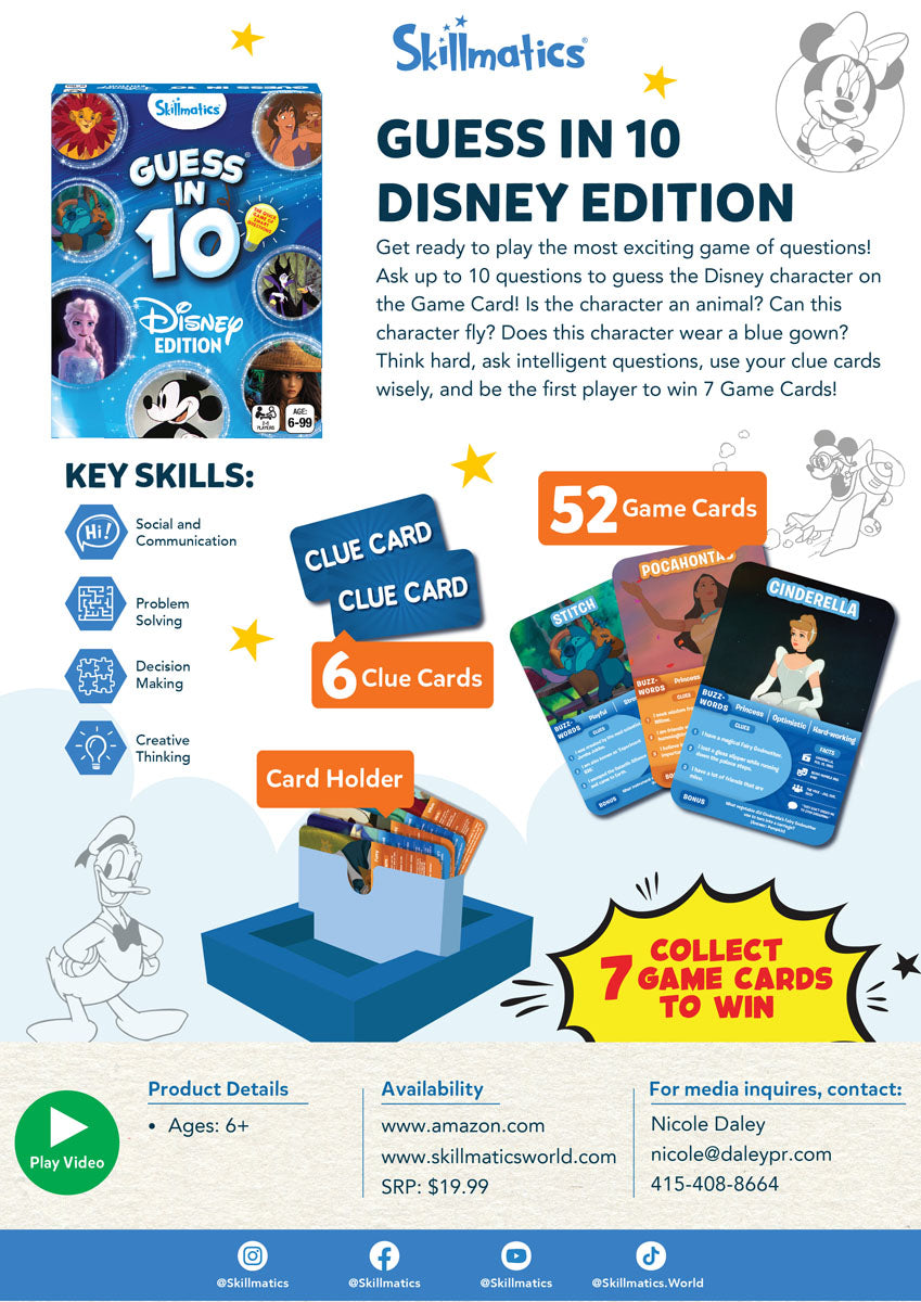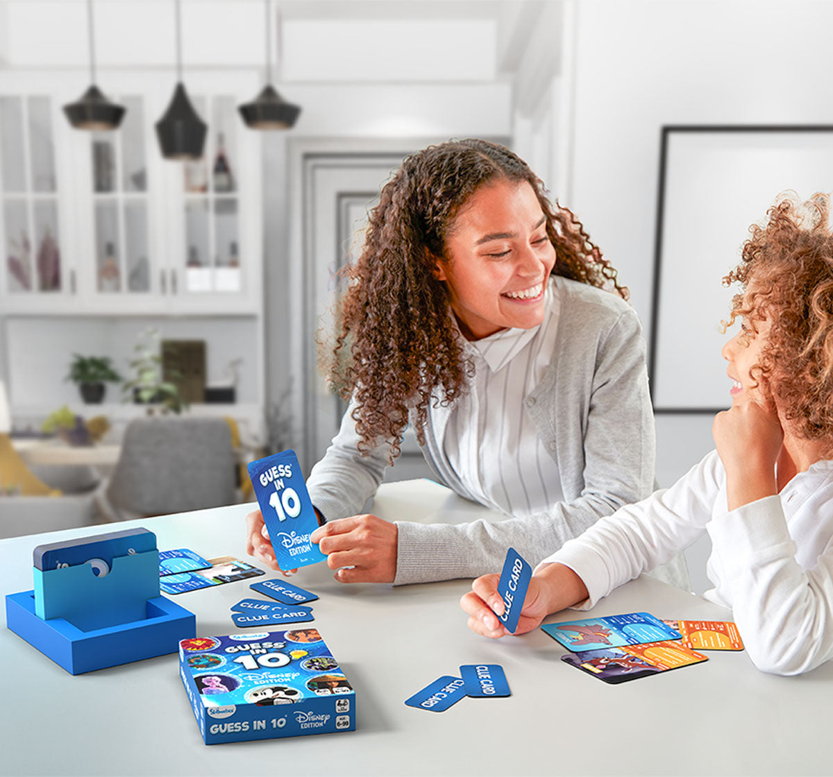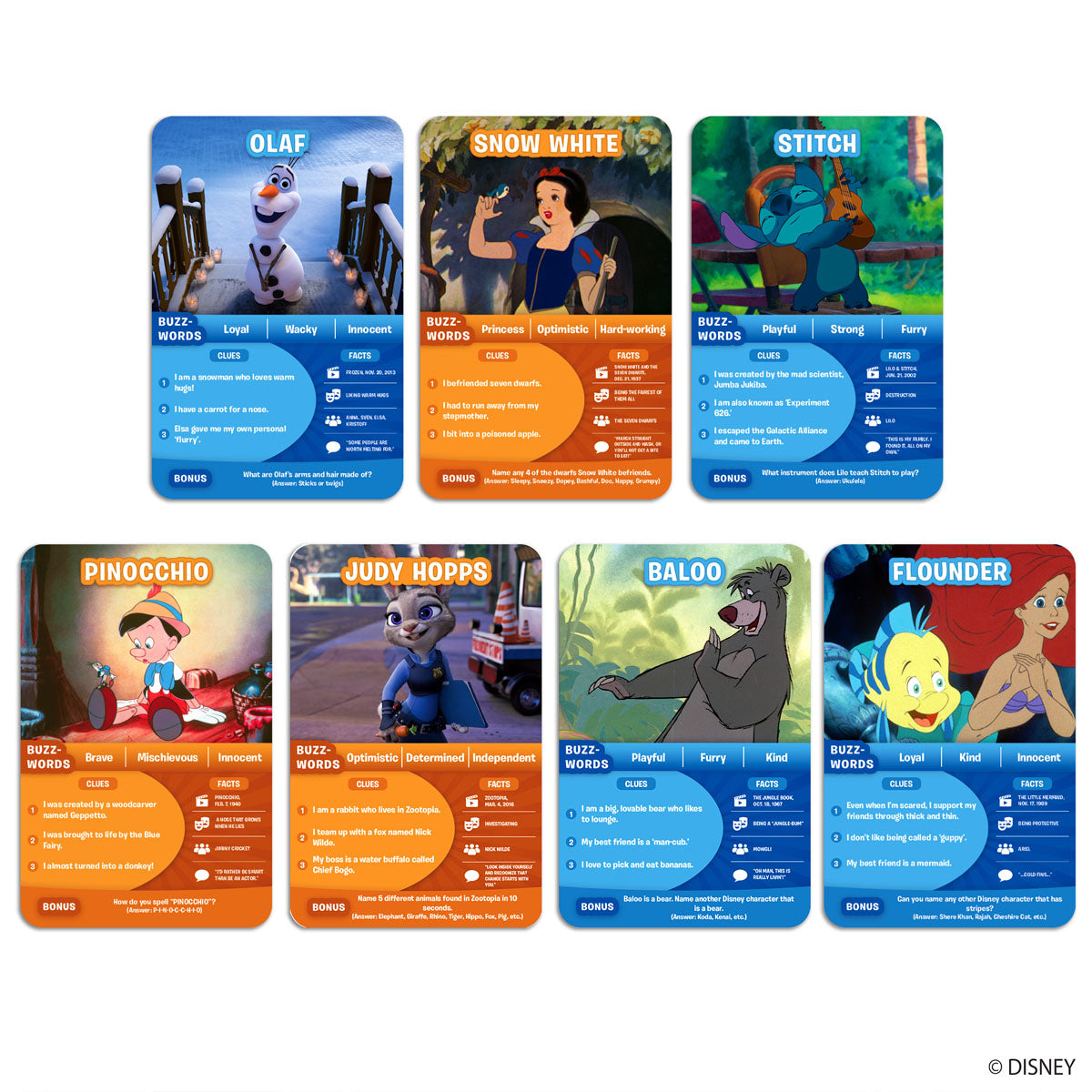 Divide yourselves up in teams, or play one on one, and ask up to 10 questions to guess the Disney character on the Game Card! Is the character an animal? Does this character wear a blue gown? Be the first player to win 7 Game Cards!