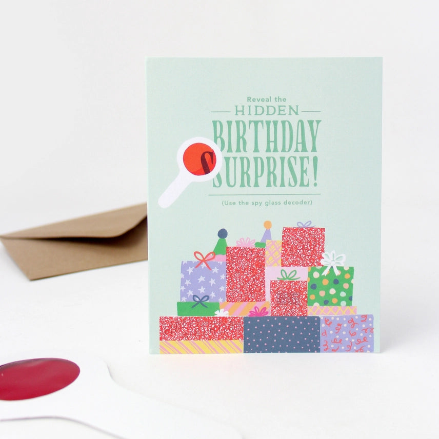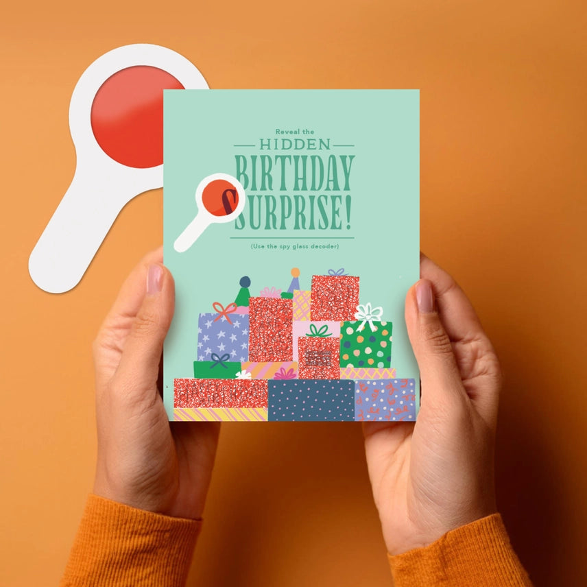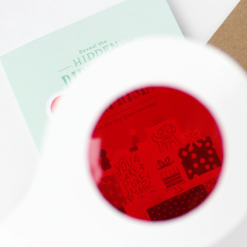 Use the included spy glass decoder to reveal a hidden message: "You are pure magic. Happy Birthday!" Wishing you the happiest of birthdays!" Decoder also reveals the contents of other gifts, including a cute puppy and a birthday cake just for them!
