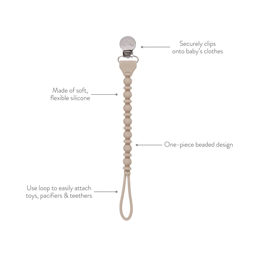Our Sweetie Strap™ is made of 100% food grade silicone and keeps pacifiers in place while also looking stylish with our new durable beaded one-piece style! The secure clasp is gentle on clothes, and the silicone cord is easy to attach to almost any pacifier, teether or small toy. This adorable Sweetie Strap™ is the perfect combination of fashion and function!