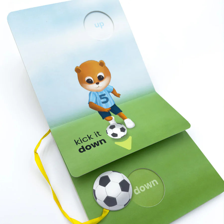 Let's talk about practice! Introducing "Kick It," an interactive board book that makes learning opposites a playful adventure! This book features a die-cut soccer ball attached with a string for hands-on fun. Move the ball up and down and all around the pages as you touch, think, and learn!
