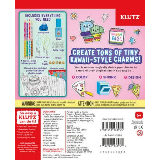 Make super cute shrink art charms and pins with over 65 designs! Make it cute and small with shrink art! Color, and shrink adorable kawaii-style creations. Choose from over 70+ punch-out designs from our printed shrink art plastic, or trace your own with activities from the book. Use the hole punch to connect charms. You can make charms that hang together or charms with parts that move (like tails that wag). With everything you need to get coloring and crafting right out of the box, this kit includes over 70 punch-out designs from our printed shrink art plastic, 3 additional blank sheets to trace designs from the book, a cute hole punch, double aided pencils with 8 colors, glaze, 5 pin backs, 8 brads, 14 jump rings, and 4 charm straps. If you can think it, you can shrink it!