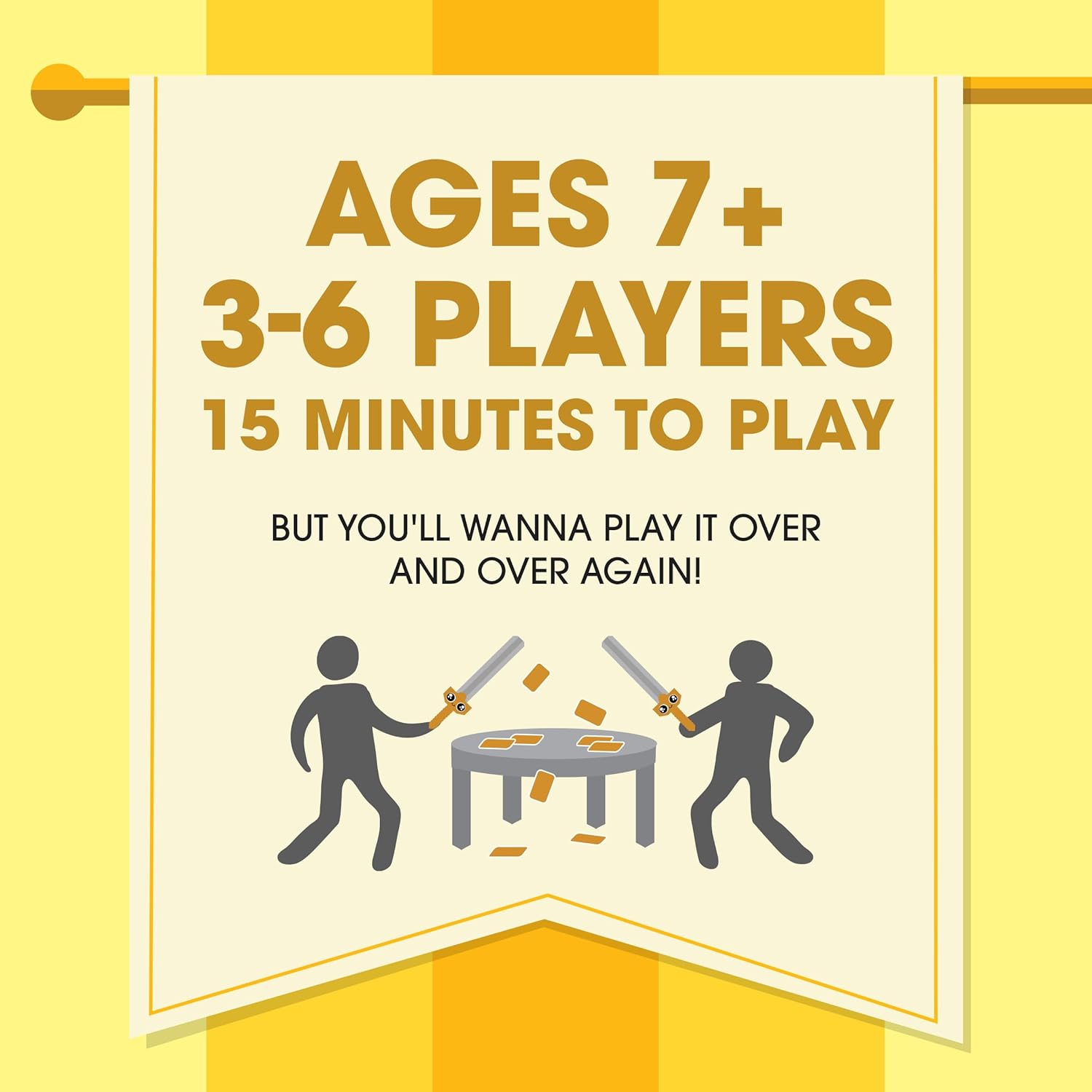 How to Play: Collect 3 sets of matching cards by choosing card Piles from the center. When multiple players pick the same Pile, duel with your fake swords using the card rules. First to hit their target wins the Pile!