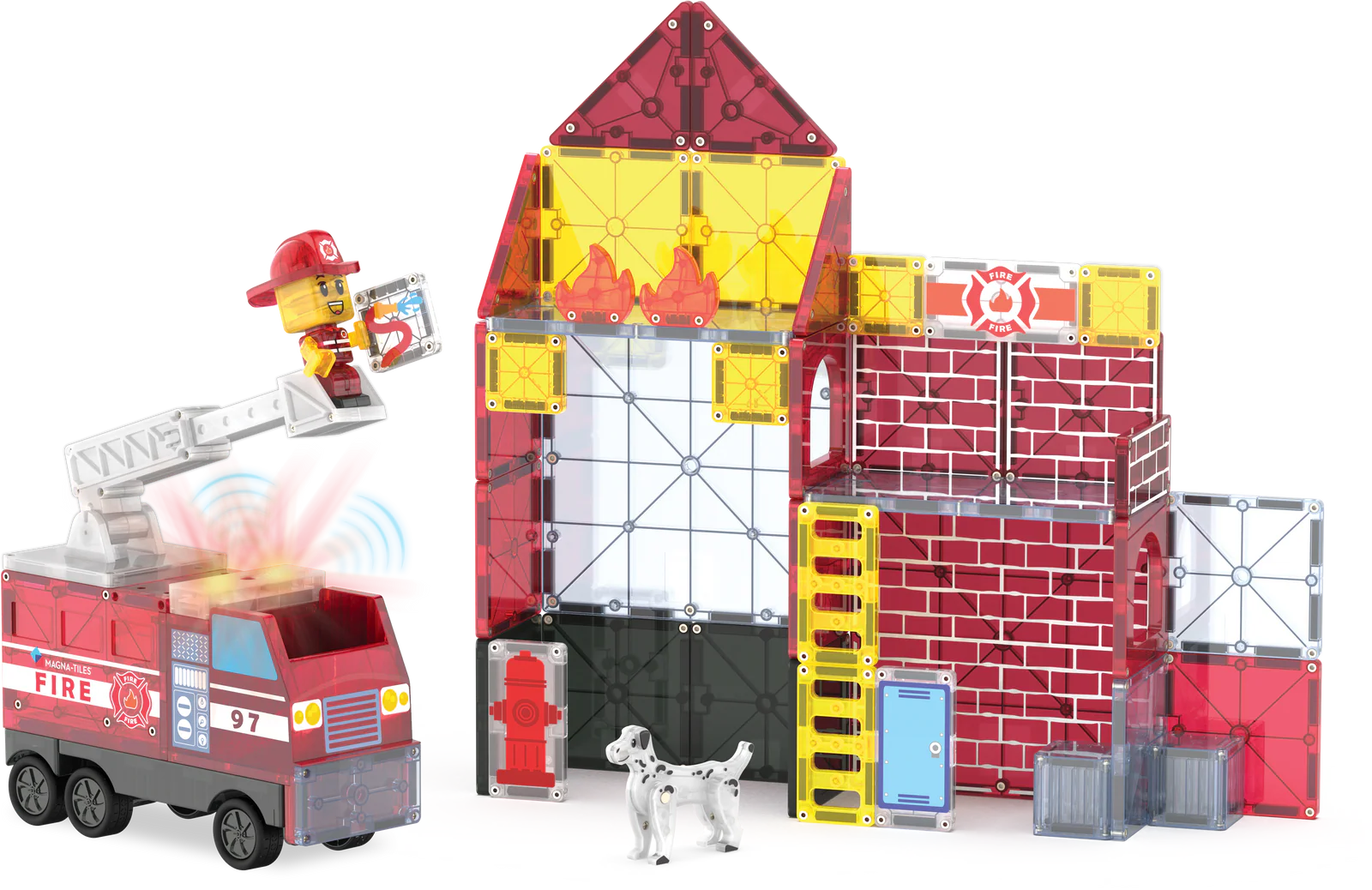 Step into action with the MAGNA-TILES Fire Station Set! Create custom rescue vehicles with the all-new modular Fire Truck, complete with an extendable ladder to tackle towering blazes. Bring playtime to life with the Light & Sound Tile, featuring flashing lights and a siren for an authentic firefighting experience. Complete with a Firefighter Figure and their trusty magnetic Dalmatian companion.