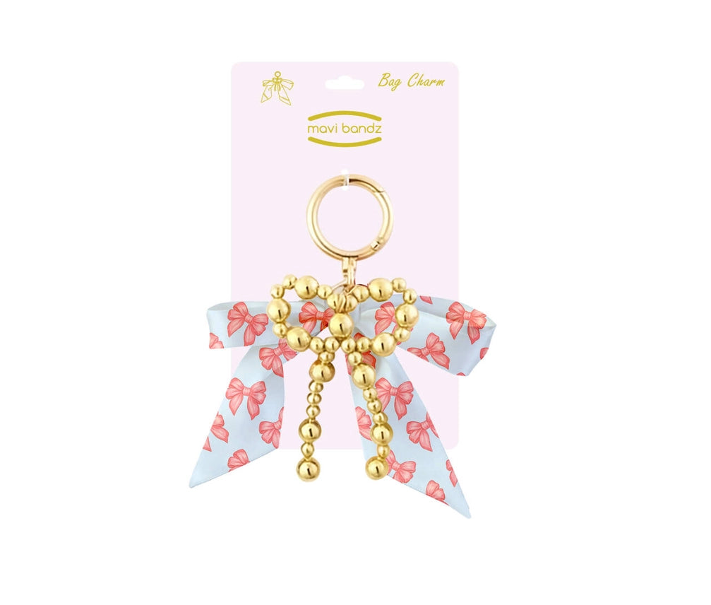 This is a new addition to the Mavi line! If you haven't seen these...they are all the rage! This is an adorable bow bag charm. The satin bow is topped with a beaded gold bow. Gold hardware makes these fancy and fun!
