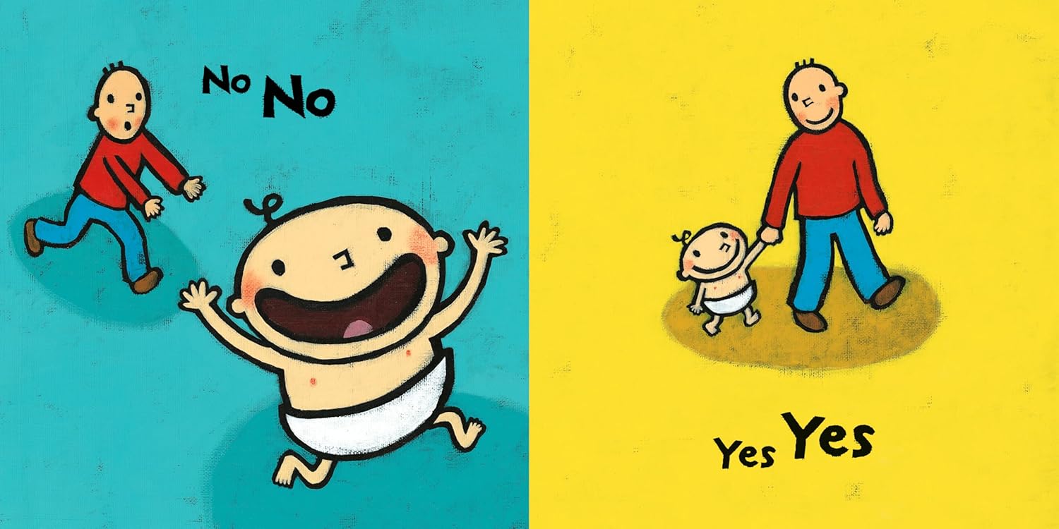 Yanking cat by tail: no NO. Gentle pat on back: yes YES. And it’s funny how dumping a bowl of food gets a very different reaction from mastering the use of a spoon. An expressive baby demonstrates familiar behaviors — and their predictable responses — in an amusing board book that merits a giant YES!