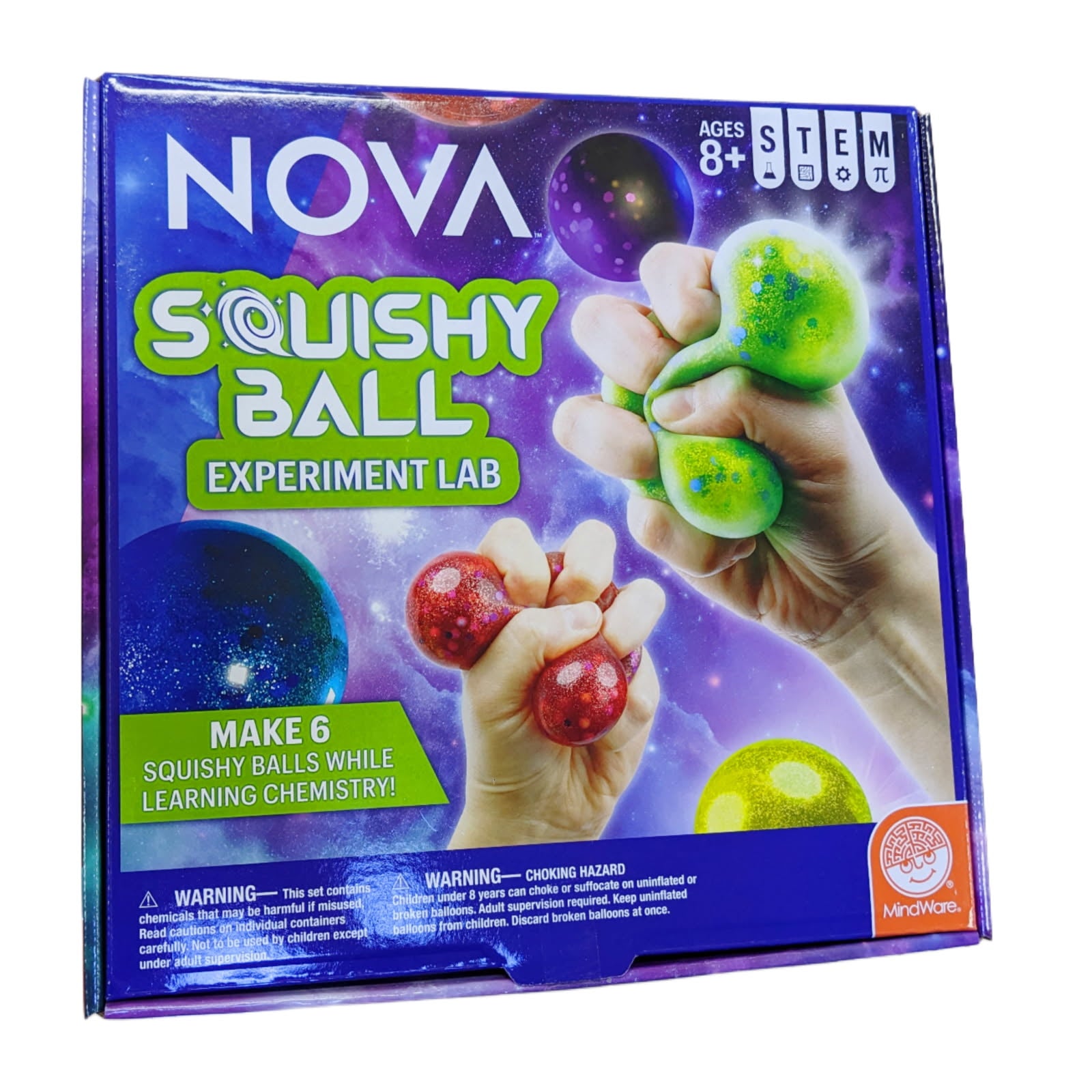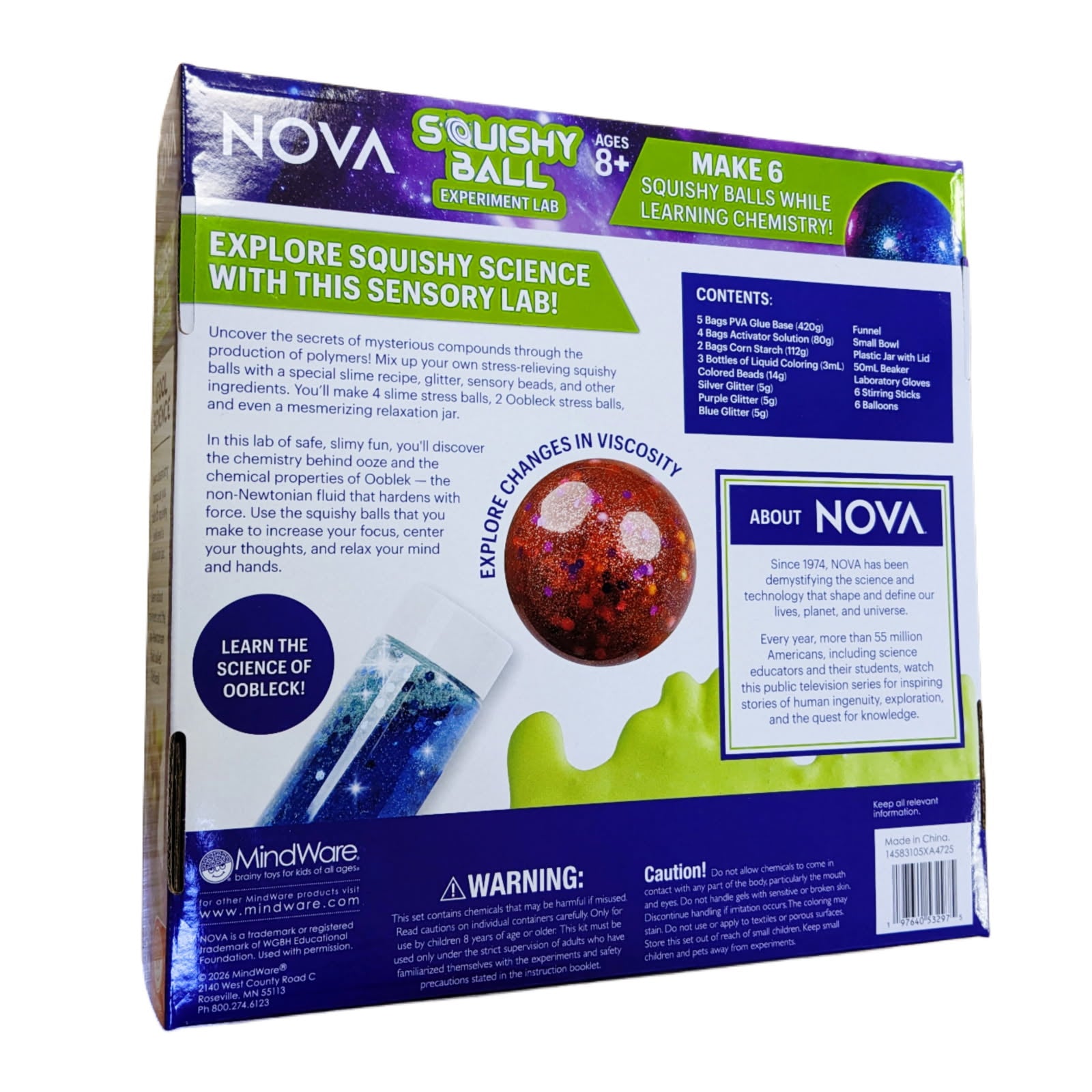 Uncover the science of squish and flow with the NOVA Squishy Ball Lab! This hands-on chemistry kit invites young scientists to mix, pour, and experiment as they learn how polymers form and how materials behave in unexpected ways. Kids will have a blast creating 4 squishy slime stress balls, 2 Oobleck stress balls made from a non-Newtonian fluid, and a mesmerizing relaxation jar filled with glitter and sensory beads. Along the way, they’ll explore real chemistry concepts, including how ingredients interact to form new compounds and why Oobleck can act like both a solid and a liquid. It’s a fun and educational sensory science activity that helps kids practice focus, creativity, and curious thinking—all while making cool, tactile creations they can squeeze and enjoy.