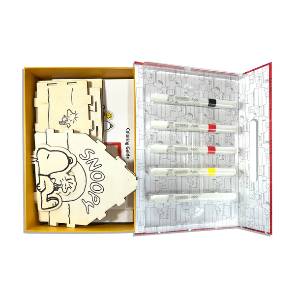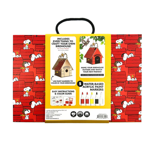 Celebrate the world of Peanuts with the OOLY x Peanuts Color-In Wooden birdhouse kit! This fun and creative DIY birdhouse making kit includes everything kids need to build and decorate their own birdhouse featuring Snoopy sleeping on his doghouse. The kit features precut wooden pieces for easy assembly, 5 acrylic paint markers for coloring and personalizing, and twine for hanging the finished birdhouse. The included instruction sheet makes it simple for young creators to complete the project, and the entire kit is packed in a Peanuts-themed carrying case for added convenience.